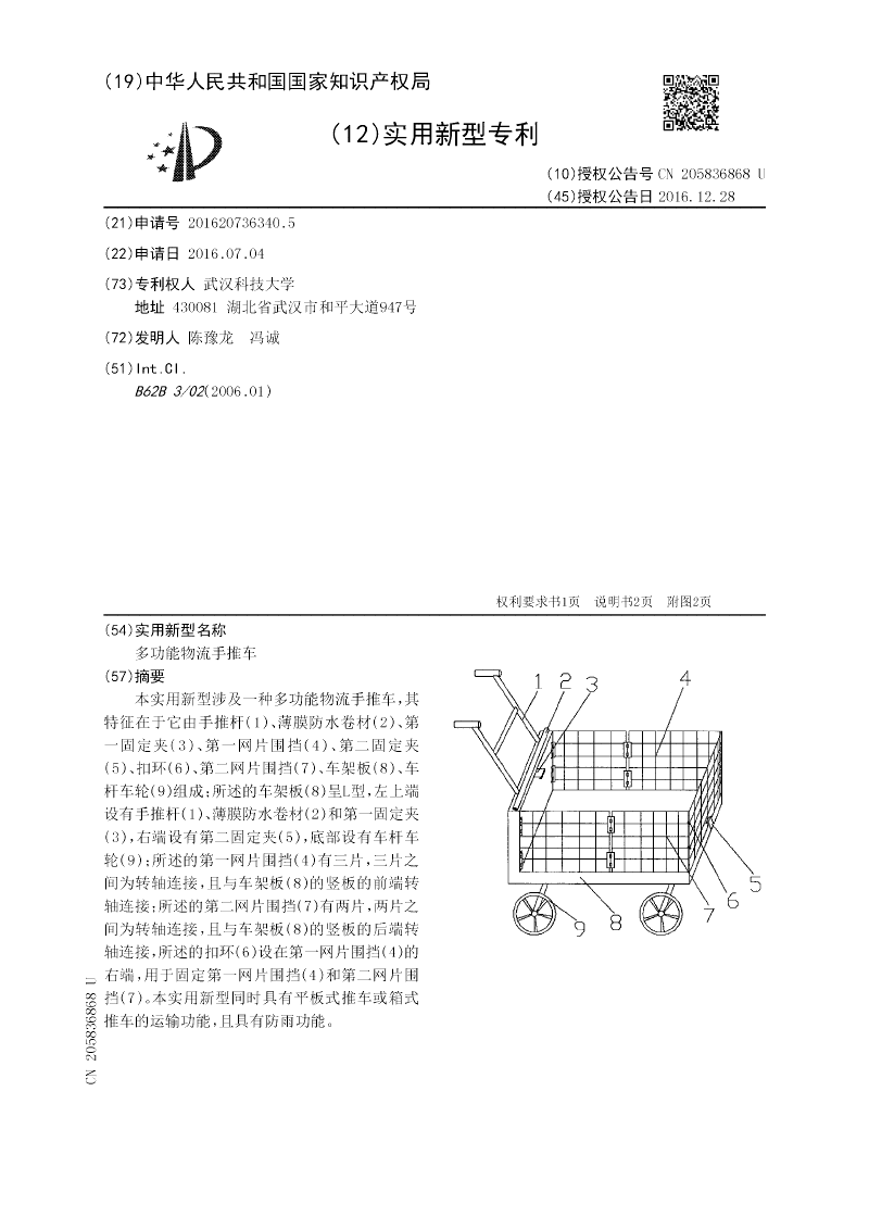 本实用新型涉及一种多功能物流手推车,其特征在于它由手推杆(1)、薄膜防水卷材(2)、第一固定夹(3)、第一网片围挡(4)、第二固定夹(5)、扣环(6)、第二网片围挡(7)、车架板(8)、车杆车轮(9)组成;所述的车架板(8)呈L型,左上端设有手推杆(1)、薄膜防水卷材(2)和第一固定夹(3),右端设有第二固定夹(5),底部设有车杆车轮(9);所述的第一网片围挡(4)有三片,三片之间为转轴连接,且与车架板(8)的竖板的前端转轴连接;所述的第二网片围挡(7)有两片,两片之间为转轴连接,且与车架板(8)的竖板的后端转轴连接,所述的扣环(6)设在第一网片围挡(4)的右端,用于固定第一网片围挡(4)和第二网片围挡(7)。本实用新型同时具有平板式推车或箱式推车的运输功能,且具有防雨功能。