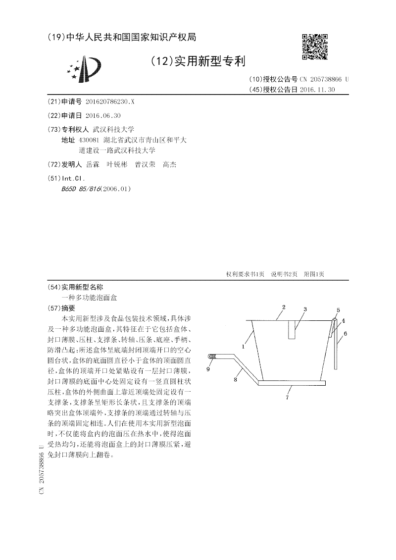 本实用新型涉及食品包装技术领域,具体涉及一种多功能泡面盒,其特征在于它包括盒体、封口薄膜、压柱、支撑条、转轴、压条、底座、手柄、防滑凸起;所述盒体呈底端封闭顶端开口的空心圆台状,盒体的底面圆直径小于盒体的顶面圆直径,盒体的顶端开口处紧贴设有一层封口薄膜,封口薄膜的底面中心处固定设有一竖直圆柱状压柱,盒体的外侧曲面上靠近顶端处固定设有一支撑条,支撑条呈矩形长条状,且支撑条的顶端略突出盒体顶端外,支撑条的顶端通过转轴与压条的顶端固定相连。人们在使用本实用新型泡面时,不仅能将盒内的泡面压在热水中,使得泡面受热均匀,还能将泡面盒上的封口薄膜压紧,避免封口薄膜向上翻卷。