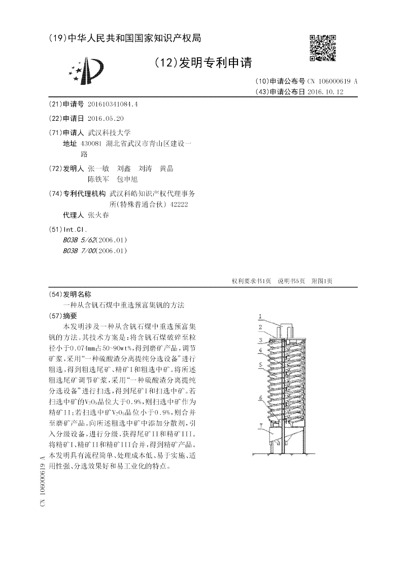 本发明涉及一种从含钒石煤中重选预富集钒的方法。其技术方案是:将含钒石煤破碎至粒径小于0.074mm占50~90wt%,得到磨矿产品,调节矿浆,采用“一种硫酸渣分离提纯分选设备”进行粗选,得到粗选尾矿、精矿I和粗选中矿。将所述粗选尾矿调节矿浆,采用“一种硫酸渣分离提纯分选设备”进行扫选,得到尾矿I和扫选中矿。若扫选中矿的V2O5品位大于0.9%,则扫选中矿作为精矿II;若扫选中矿V2O5品位小于0.9%,则合并至磨矿产品。向所述粗选中矿中添加分散剂,引入分级设备,进行分级,获得尾矿II和精矿III。将精矿I、精矿II和精矿III合并,得到精矿产品。本发明具有流程简单、处理成本低、易于实施、适用性强、分选效果好和易工业化的特点。