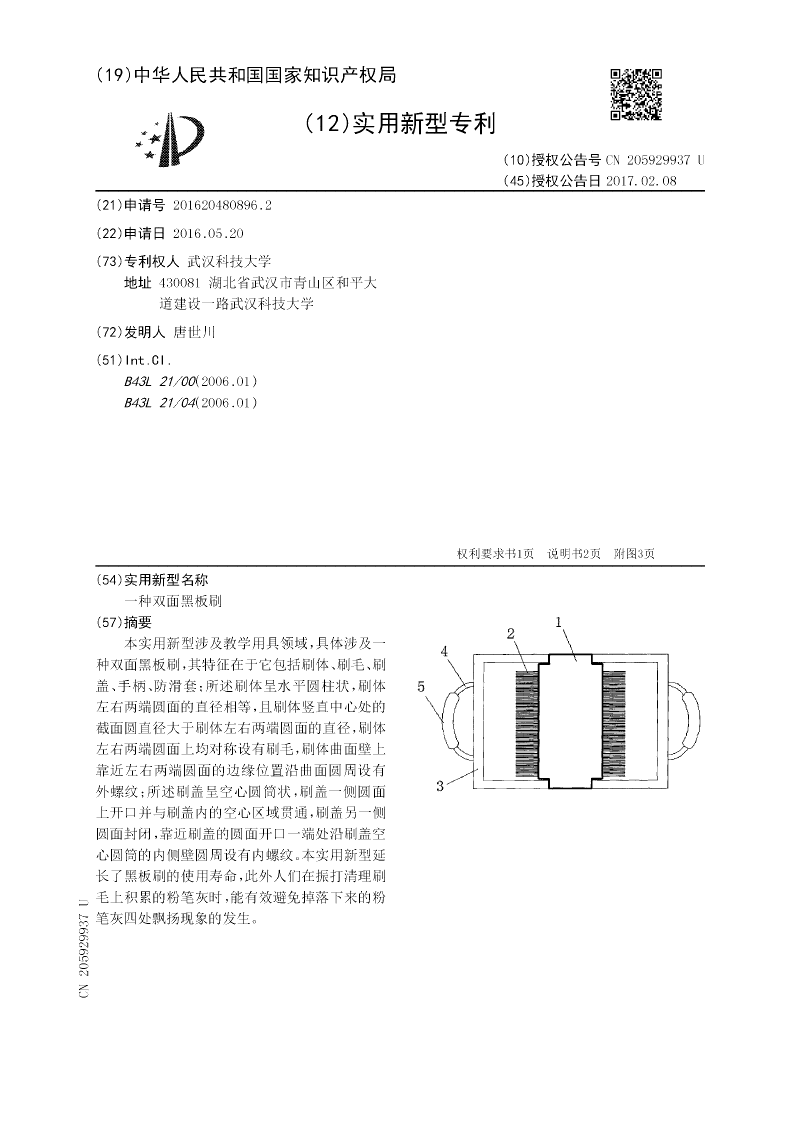 本实用新型涉及教学用具领域,具体涉及一种双面黑板刷,其特征在于它包括刷体、刷毛、刷盖、手柄、防滑套;所述刷体呈水平圆柱状,刷体左右两端圆面的直径相等,且刷体竖直中心处的截面圆直径大于刷体左右两端圆面的直径,刷体左右两端圆面上均对称设有刷毛,刷体曲面壁上靠近左右两端圆面的边缘位置沿曲面圆周设有外螺纹;所述刷盖呈空心圆筒状,刷盖一侧圆面上开口并与刷盖内的空心区域贯通,刷盖另一侧圆面封闭,靠近刷盖的圆面开口一端处沿刷盖空心圆筒的内侧壁圆周设有内螺纹。本实用新型延长了黑板刷的使用寿命,此外人们在振打清理刷毛上积累的粉笔灰时,能有效避免掉落下来的粉笔灰四处飘扬现象的发生。