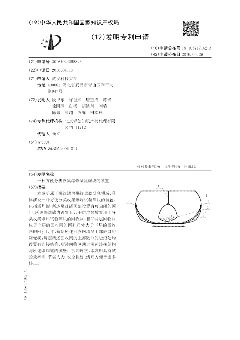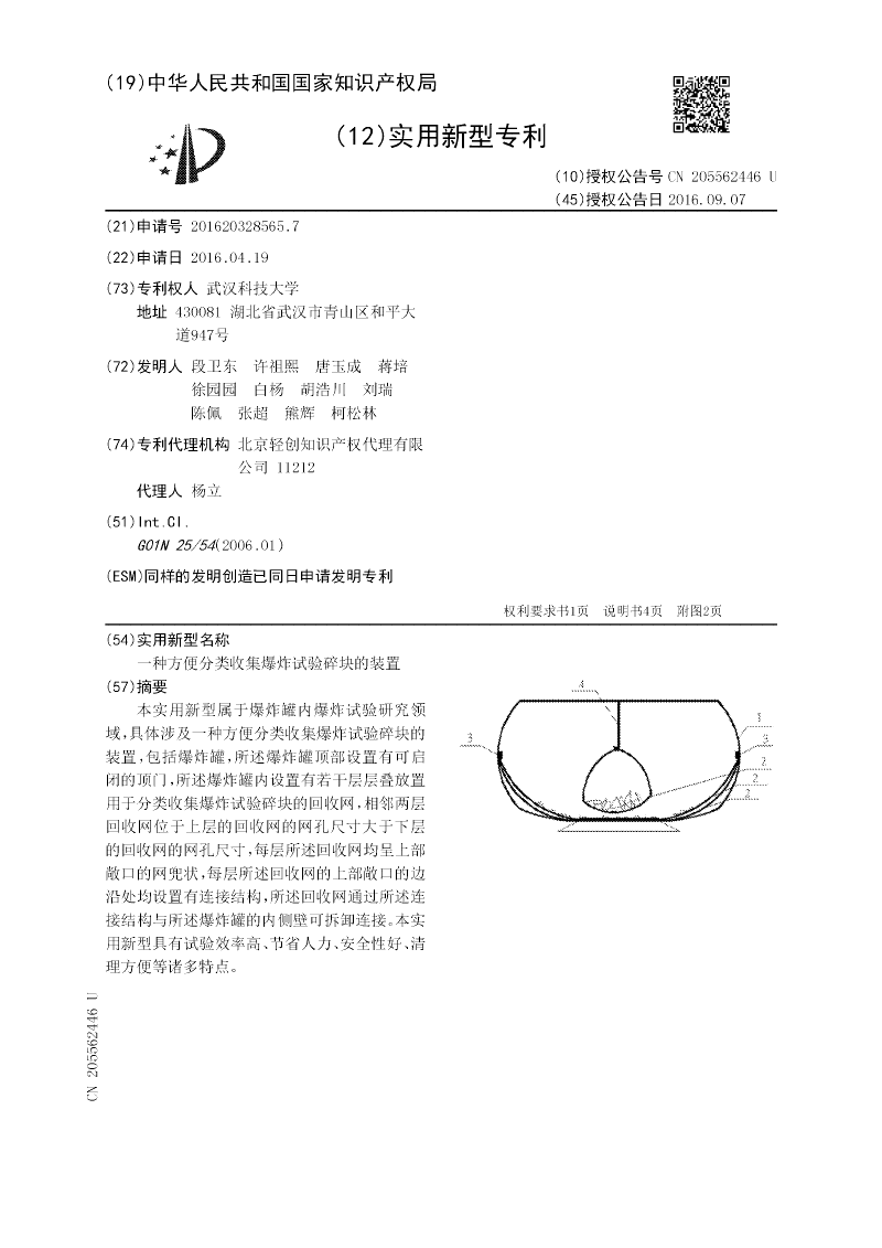 本实用新型属于爆炸罐内爆炸试验研究领域,具体涉及一种方便分类收集爆炸试验碎块的装置,包括爆炸罐,所述爆炸罐顶部设置有可启闭的顶门,所述爆炸罐内设置有若干层层叠放置用于分类收集爆炸试验碎块的回收网,相邻两层回收网位于上层的回收网的网孔尺寸大于下层的回收网的网孔尺寸,每层所述回收网均呈上部敞口的网兜状,每层所述回收网的上部敞口的边沿处均设置有连接结构,所述回收网通过所述连接结构与所述爆炸罐的内侧壁可拆卸连接。本实用新型具有试验效率高、节省人力、安全性好、清理方便等诸多特点。