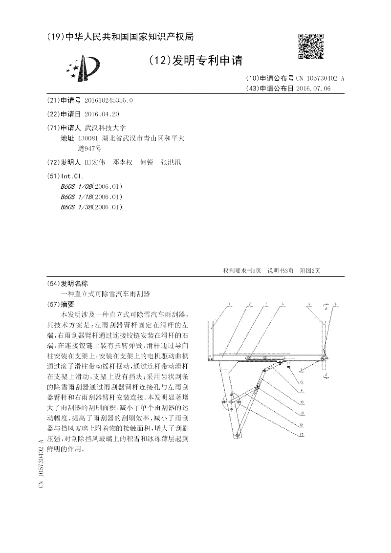 本实用新型涉及一种直立式可除雪汽车雨刮器,其技术方案是:左雨刮器臂杆(1)固定在滑杆(2)的左端,右雨刮器臂杆(5)通过连接铰链(7)安装在滑杆(2)的右端,在连接铰链(7)上装有扭转弹簧(6),滑杆(2)通过导向柱(4)安装在支架(3)上;安装在支架(3)上的电机(13)驱动曲柄(12)通过滚子滑柱(11)带动摇杆(10)摆动,通过连杆(9)带动滑杆(2)在支架(3)上滑动,支架(3)上设有挡块(8);采用齿状刮条(15)的除雪雨刮器(14)通过雨刮器臂杆连接孔(16)与左雨刮器臂杆(1)和右雨刮器臂杆(5)安装连接。