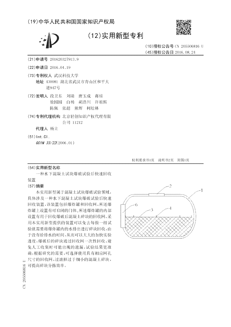本实用新型属于混凝土试块爆破试验领域,具体涉及一种水下混凝土试块爆破试验后快速回收装置,该装置包括爆炸罐和回收网,所述爆炸罐上设置有可启闭的门体,所述爆炸罐的内部设置有用于回收爆破后混凝土碎块的回收网。采用本实用新型提供的装置可以免去每做一组试验就需要将爆炸罐内的水排出进行碎块回收,由于没有给排水的时间,从而可以大大的加快实验进度;爆破后的碎块通过回收网一次性回收,避免人工收集时可能出现的遗漏,试验结果更准确;根据研究的需要,可选择使用具有相应网孔尺寸的回收网,过滤掉过于细小的混凝土碎块,可提高碎块分拣效率。