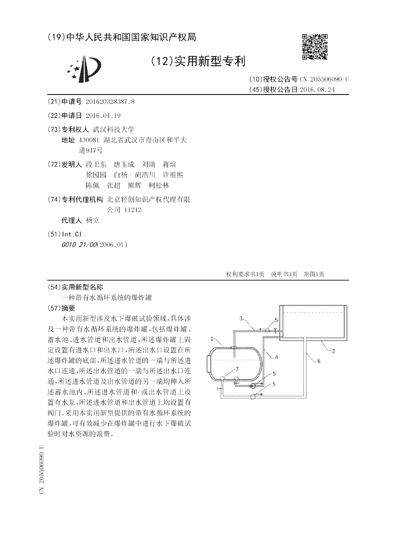 本实用新型涉及水下爆破试验领域,具体涉及一种带有水循环系统的爆炸罐,包括爆炸罐、蓄水池、进水管道和出水管道,所述爆炸罐上固定设置有进水口和出水口,所述出水口设置在所述爆炸罐的底部,所述进水管道的一端与所述进水口连通,所述出水管道的一端与所述出水口连通,所述进水管道及出水管道的另一端均伸入所述蓄水池内,所述进水管道和/或出水管道上设置有水泵,所述进水管道和出水管道上均设置有阀门。采用本实用新型提供的带有水循环系统的爆炸罐,可有效减少在爆炸罐中进行水下爆破试验时对水资源的浪费。