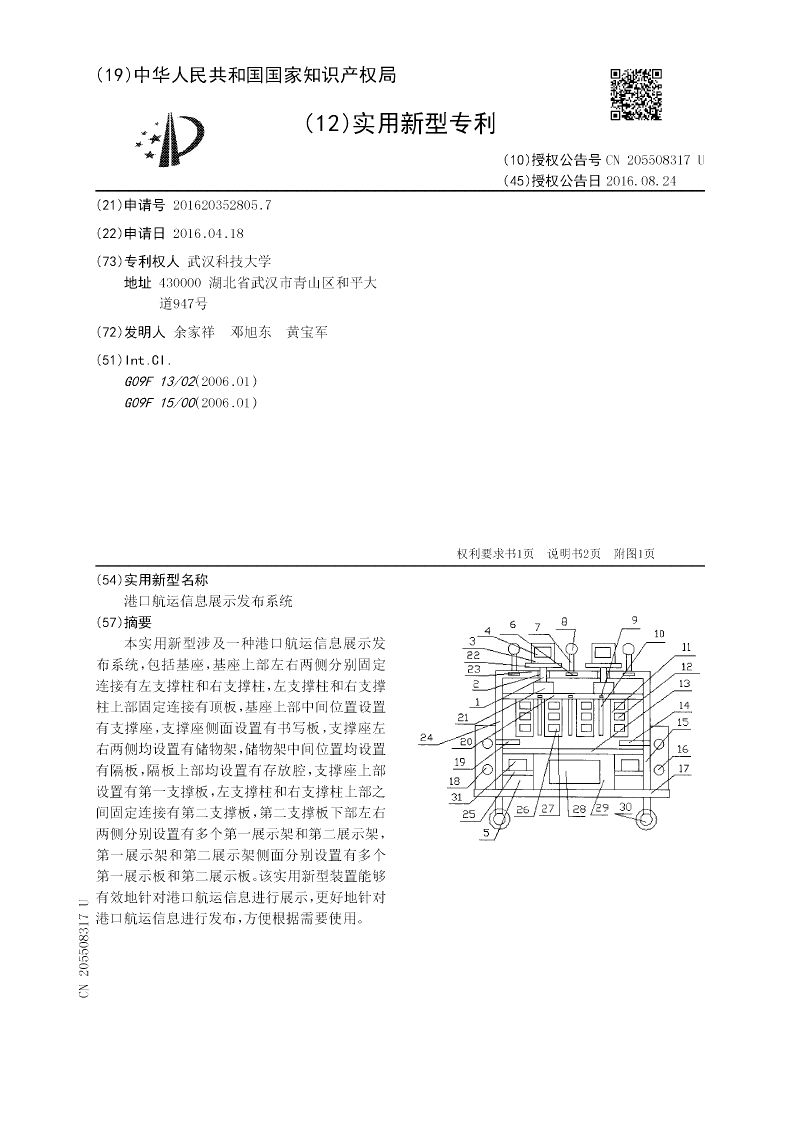 本实用新型涉及一种港口航运信息展示发布系统,包括基座,基座上部左右两侧分别固定连接有左支撑柱和右支撑柱,左支撑柱和右支撑柱上部固定连接有顶板,基座上部中间位置设置有支撑座,支撑座侧面设置有书写板,支撑座左右两侧均设置有储物架,储物架中间位置均设置有隔板,隔板上部均设置有存放腔,支撑座上部设置有第一支撑板,左支撑柱和右支撑柱上部之间固定连接有第二支撑板,第二支撑板下部左右两侧分别设置有多个第一展示架和第二展示架,第一展示架和第二展示架侧面分别设置有多个第一展示板和第二展示板。该实用新型装置能够有效地针对港口航运信息进行展示,更好地针对港口航运信息进行发布,方便根据需要使用。