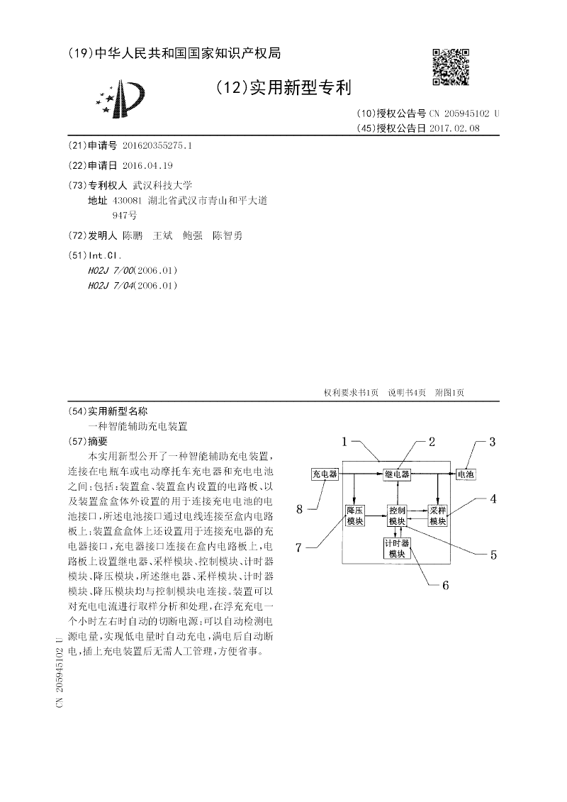 本实用新型公开了一种智能辅助充电装置,连接在电瓶车或电动摩托车充电器和充电电池之间;包括:装置盒、装置盒内设置的电路板、以及装置盒盒体外设置的用于连接充电电池的电池接口,所述电池接口通过电线连接至盒内电路板上;装置盒盒体上还设置用于连接充电器的充电器接口,充电器接口连接在盒内电路板上,电路板上设置继电器、采样模块、控制模块、计时器模块、降压模块,所述继电器、采样模块、计时器模块、降压模块均与控制模块电连接。装置可以对充电电流进行取样分析和处理,在浮充充电一个小时左右时自动的切断电源;可以自动检测电源电量,实现低电量时自动充电,满电后自动断电,插上充电装置后无需人工管理,方便省事。