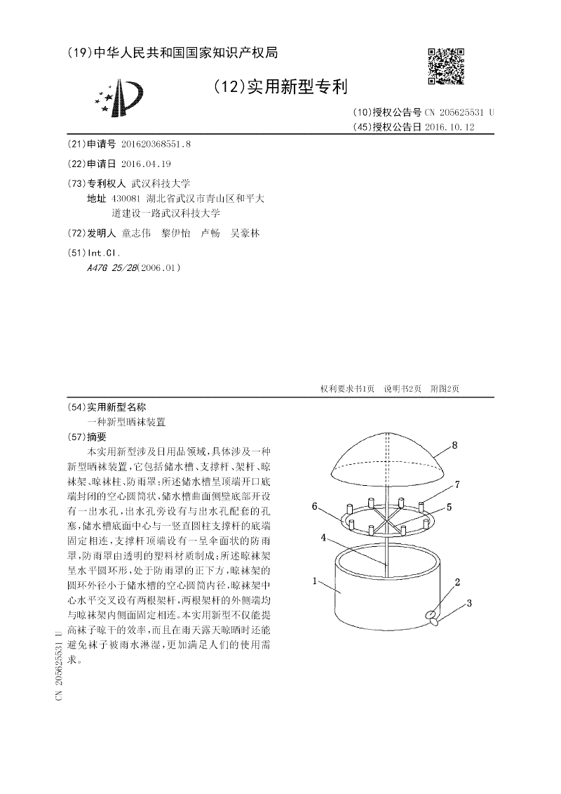 本实用新型涉及日用品领域,具体涉及一种新型晒袜装置,它包括储水槽、支撑杆、架杆、晾袜架、晾袜柱、防雨罩;所述储水槽呈顶端开口底端封闭的空心圆筒状,储水槽曲面侧壁底部开设有一出水孔,出水孔旁设有与出水孔配套的孔塞,储水槽底面中心与一竖直圆柱支撑杆的底端固定相连,支撑杆顶端设有一呈伞面状的防雨罩,防雨罩由透明的塑料材质制成;所述晾袜架呈水平圆环形,处于防雨罩的正下方,晾袜架的圆环外径小于储水槽的空心圆筒内径,晾袜架中心水平交叉设有两根架杆,两根架杆的外侧端均与晾袜架内侧面固定相连。本实用新型不仅能提高袜子晾干的效率,而且在雨天露天晾晒时还能避免袜子被雨水淋湿,更加满足人们的使用需求。