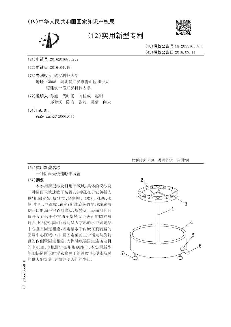 本实用新型涉及日用品领域,具体的说涉及一种阴雨天快速晾干装置,其特征在于它包括支撑轴、固定架、旋转盘、储水槽、出水孔、孔塞、滚轮、电机、电源线、底座;所述旋转盘呈顶端底端均开口的扁平空心圆筒状,旋转盘上表面沿其圆周开设有若干个贯通至旋转盘下表面的圆柱形通孔;所述支撑轴顶端与呈人字形的水平固定架中心垂直固定相连,固定架水平内嵌在旋转盘的圆周中心区域中,并且固定架的三个端点与旋转盘的内侧壁固定相连,支撑轴底端固定连接电机的电机轴,电机固定在矩形底座上。本实用新型能加快阴雨天时湿衣物晾干的速度,以便能及时的供人们穿着,更加方便人们的生活。