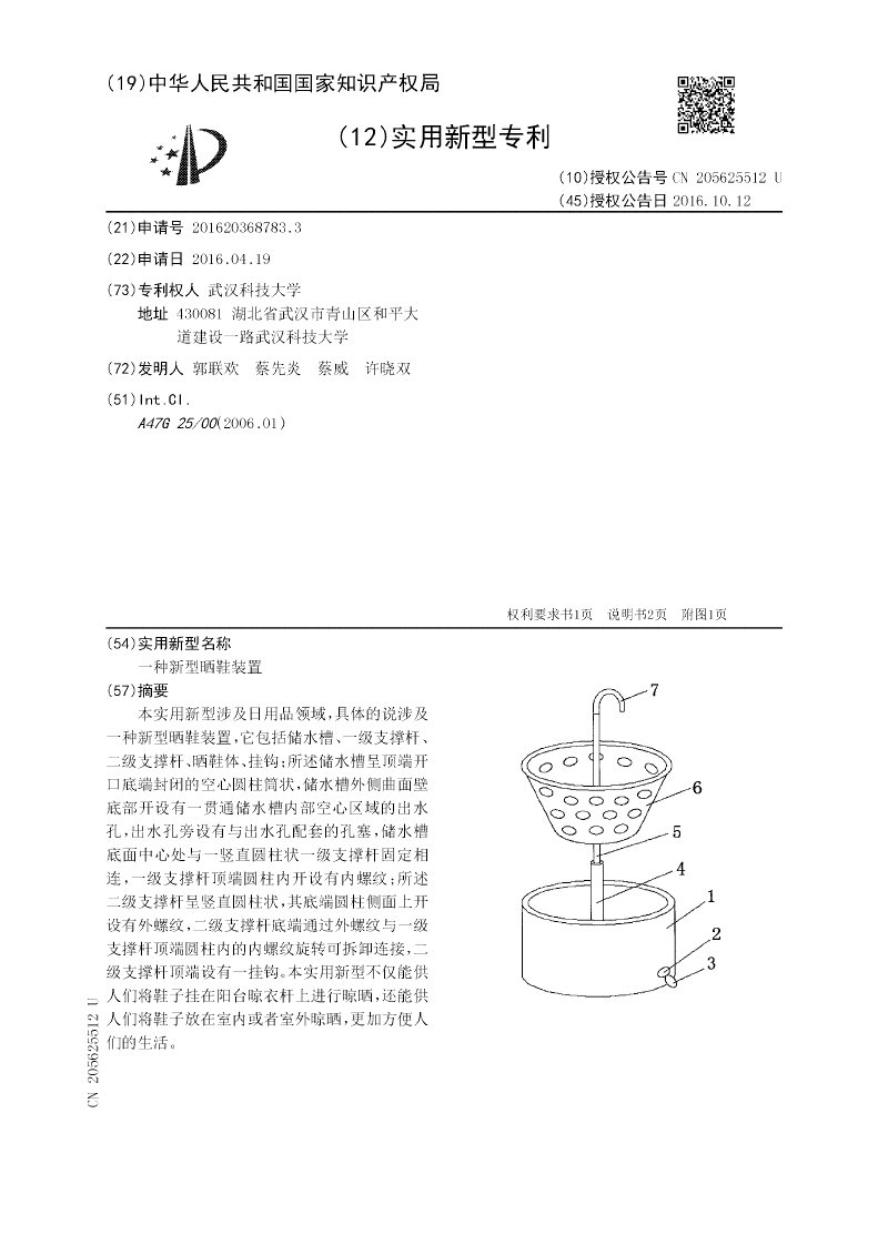 本实用新型涉及日用品领域,具体的说涉及一种新型晒鞋装置,它包括储水槽、一级支撑杆、二级支撑杆、晒鞋体、挂钩;所述储水槽呈顶端开口底端封闭的空心圆柱筒状,储水槽外侧曲面壁底部开设有一贯通储水槽内部空心区域的出水孔,出水孔旁设有与出水孔配套的孔塞,储水槽底面中心处与一竖直圆柱状一级支撑杆固定相连,一级支撑杆顶端圆柱内开设有内螺纹;所述二级支撑杆呈竖直圆柱状,其底端圆柱侧面上开设有外螺纹,二级支撑杆底端通过外螺纹与一级支撑杆顶端圆柱内的内螺纹旋转可拆卸连接,二级支撑杆顶端设有一挂钩。本实用新型不仅能供人们将鞋子挂在阳台晾衣杆上进行晾晒,还能供人们将鞋子放在室内或者室外晾晒,更加方便人们的生活。