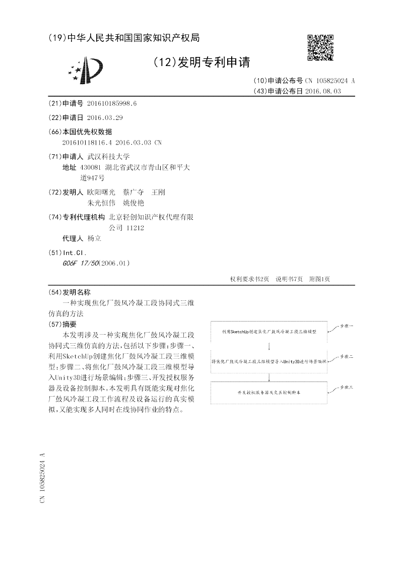 本发明涉及一种实现焦化厂鼓风冷凝工段协同式三维仿真的方法,包括以下步骤:步骤一、利用SketchUp创建焦化厂鼓风冷凝工段三维模型;步骤二、将焦化厂鼓风冷凝工段三维模型导入Unity3D进行场景编辑;步骤三、开发授权服务器及设备控制脚本。本发明具有既能实现对焦化厂鼓风冷凝工段工作流程及设备运行的真实模拟,又能实现多人同时在线协同作业的特点。