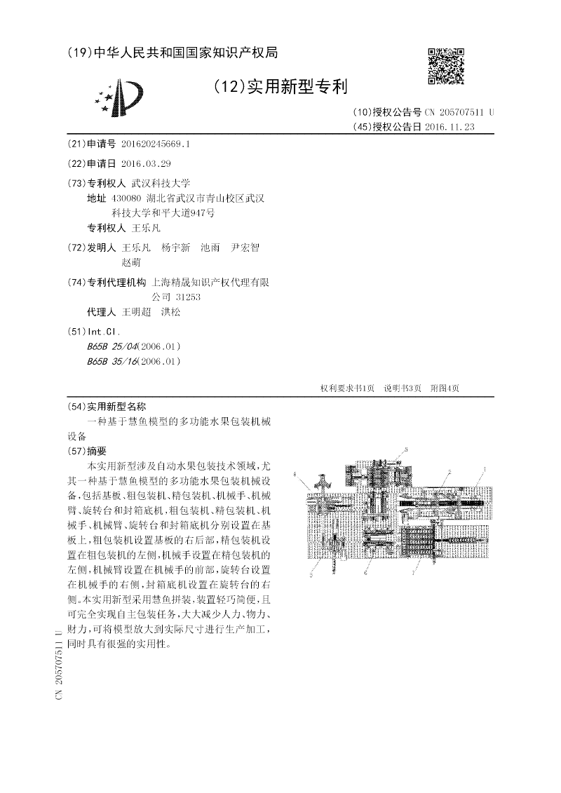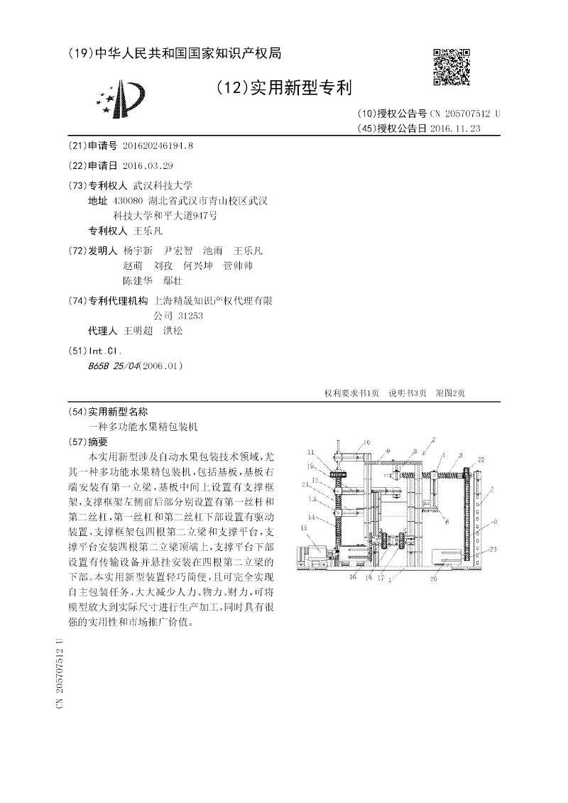 本实用新型涉及自动水果包装技术领域,尤其一种多功能水果精包装机,包括基板,基板右端安装有第一立梁,基板中间上设置有支撑框架,支撑框架左侧前后部分别设置有第一丝杆和第二丝杠,第一丝杠和第二丝杠下部设置有驱动装置,支撑框架包四根第二立梁和支撑平台,支撑平台安装四根第二立梁顶端上,支撑平台下部设置有传输设备并悬挂安装在四根第二立梁的下部。本实用新型装置轻巧简便,且可完全实现自主包装任务,大大减少人力、物力、财力,可将模型放大到实际尺寸进行生产加工,同时具有很强的实用性和市场推广价值。