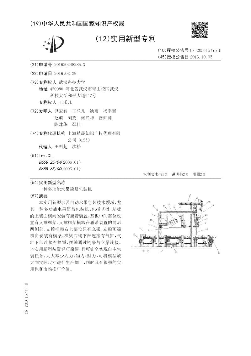 本实用新型涉及自动水果包装技术领域,尤其一种多功能水果简易包装机,包括基板,基板的上端面横向安装有履带装置,基板中间部位设置有支撑框架,支撑框架横跨在履带装置的前后两侧部,支撑框架右上部设只有立梁,立梁顶端横向安装有横梁,横梁右端下部连接有气缸,气缸下部连接有摆锤,摆锤通过链条与立梁连接。本实用新型装置轻巧简便,且可完全实现自主包装任务,大大减少人力、物力、财力,可将模型放大到实际尺寸进行生产加工,同时具有很强的实用性和市场推广价值。