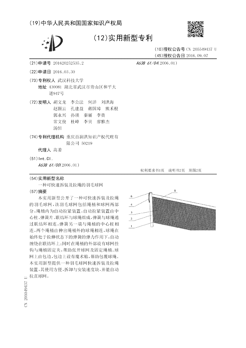 本实用新型公开了一种可快速拆装及拉绳的羽毛球网,该羽毛球网包括绳桶和球网两部分,绳桶内为自动拉紧装置,自动拉紧装置由中心柱、弹簧片、联结环与球绳组成,弹簧与球绳通过联结环相连,弹簧另一端与绳桶的中心柱相连,两个绳桶由伸出绳桶外的球绳相连,球绳在始终处于拉伸状态下的弹簧的弹力作用下,自动缠绕在联结环上;同时在绳桶的外部设有球网挂钩与绳桶固定夹,帮助张开球网及固定绳桶。球网上由包边,包边上设有魔术贴,帮助包覆球绳。本实用新型提供一种羽毛球网快速拆装及拉绳装置,其使用方便,拆卸与安装速度块,并能自动拉直球网。