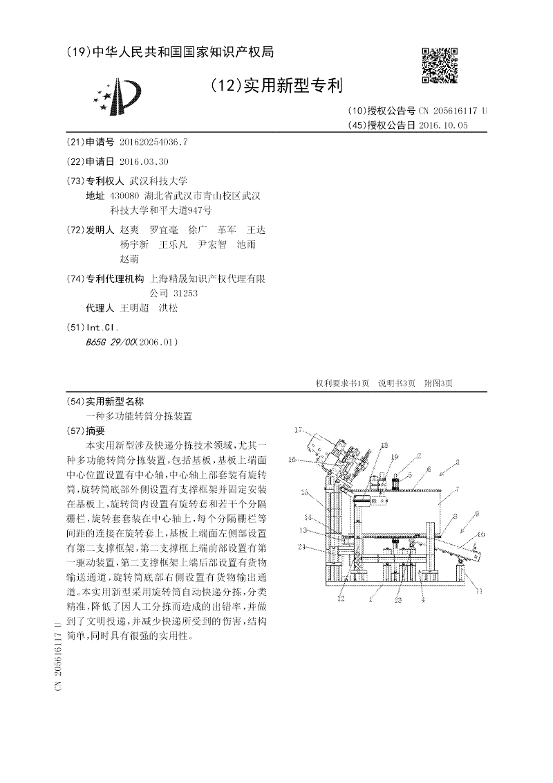 本实用新型涉及快递分拣技术领域,尤其一种多功能转筒分拣装置,包括基板,基板上端面中心位置设置有中心轴,中心轴上部套装有旋转筒,旋转筒底部外侧设置有支撑框架并固定安装在基板上,旋转筒内设置有旋转套和若干个分隔栅栏,旋转套套装在中心轴上,每个分隔栅栏等间距的连接在旋转套上,基板上端面左侧部设置有第二支撑框架,第二支撑框上端前部设置有第一驱动装置,第二支撑框架上端后部设置有货物输送通道,旋转筒底部右侧设置有货物输出通道。本实用新型采用旋转筒自动快递分拣,分类精准,降低了因人工分拣而造成的出错率,并做到了文明投递,并减少快递所受到的伤害,结构简单,同时具有很强的实用性。