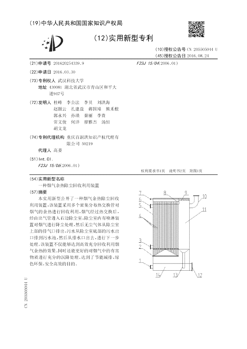 本实用新型公开了一种烟气余热除尘回收利用装置,该装置采用多个密集分布热交换管对烟气的余热进行回收利用,烟气经过热交换后,经由出气管进入右边除尘室,除尘室内有喷淋装置对烟气进行降尘处理,然后无尘气体从除尘室上部的排气口排出,污水从除尘室底部的污水出口排到污水池,然后从排水口出去,进行下一步处理。该装置不仅能够达到高效充分回收利用烟气余热的效果。同时还能更好的对烟气中的有害物质进行充分的沉降处理。达到了节能减排,绿色环保,安全高效的目的。