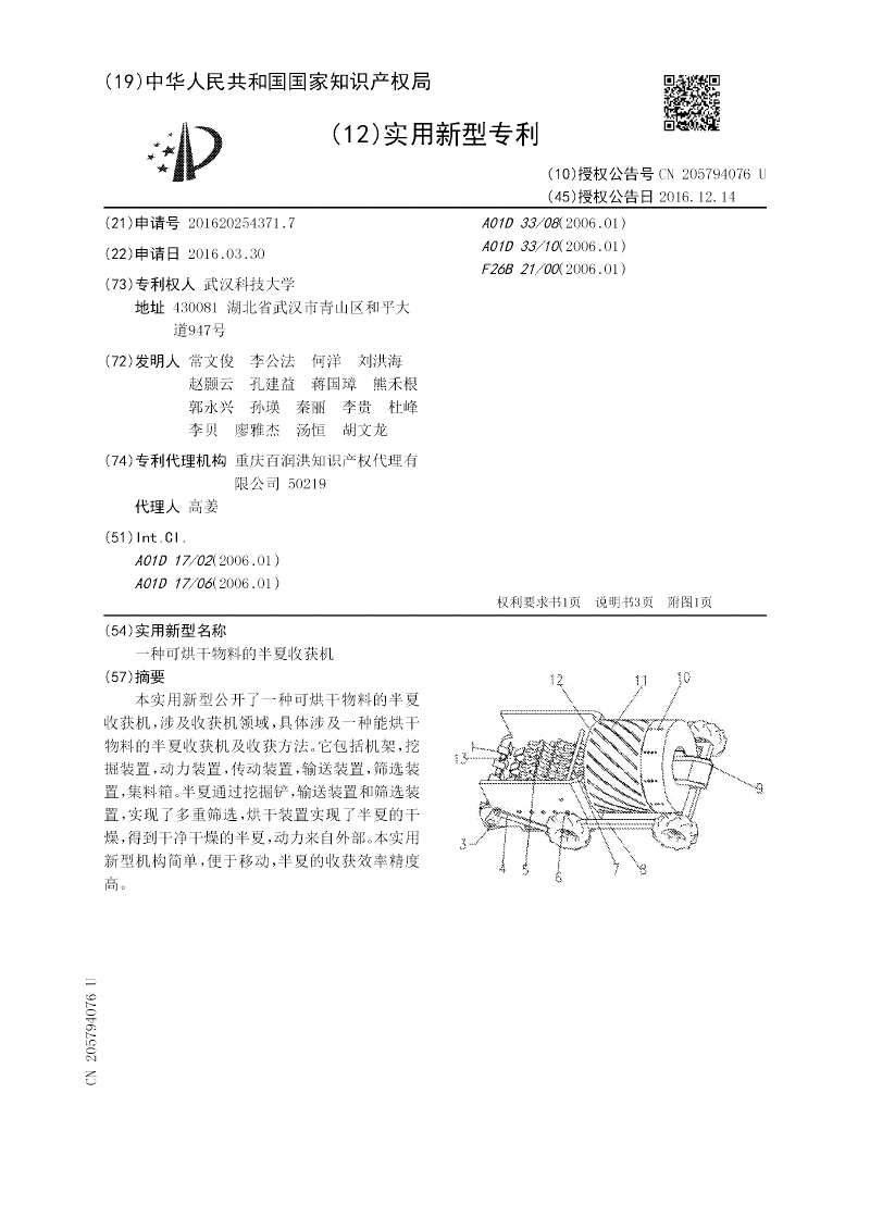 本实用新型公开了一种可烘干物料的半夏收获机,涉及收获机领域,具体涉及一种能烘干物料的半夏收获机及收获方法。它包括机架,挖掘装置,动力装置,传动装置,输送装置,筛选装置,集料箱。半夏通过挖掘铲,输送装置和筛选装置,实现了多重筛选,烘干装置实现了半夏的干燥,得到干净干燥的半夏,动力来自外部。本实用新型机构简单,便于移动,半夏的收获效率精度高。