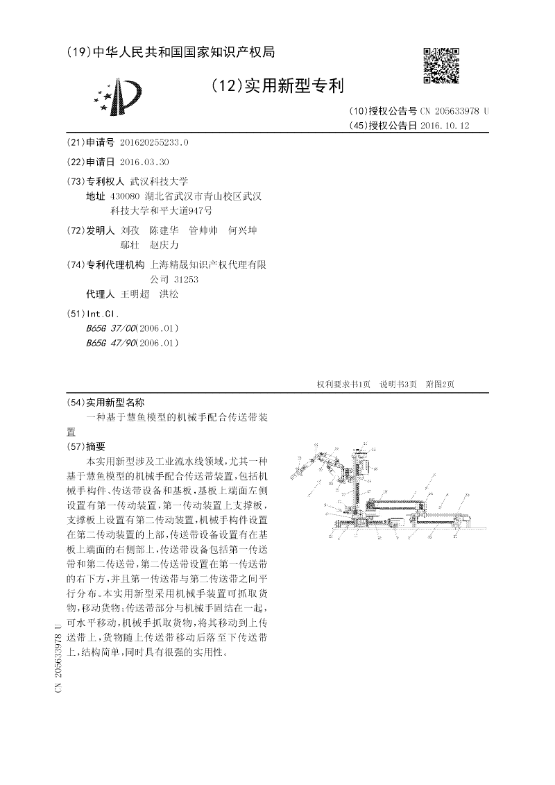 本实用新型涉及工业流水线领域,尤其一种基于慧鱼模型的机械手配合传送带装置,包括机械手构件、传送带设备和基板,基板上端面左侧设置有第一传动装置,第一传动装置上支撑板,支撑板上设置有第二传动装置,机械手构件设置在第二传动装置的上部,传送带设备设置有在基板上端面的右侧部上,传送带设备包括第一传送带和第二传送带,第二传送带设置在第一传送带的右下方,并且第一传送带与第二传送带之间平行分布。本实用新型采用机械手装置可抓取货物,移动货物;传送带部分与机械手固结在一起,可水平移动,机械手抓取货物,将其移动到上传送带上,货物随上传送带移动后落至下传送带上,结构简单,同时具有很强的实用性。