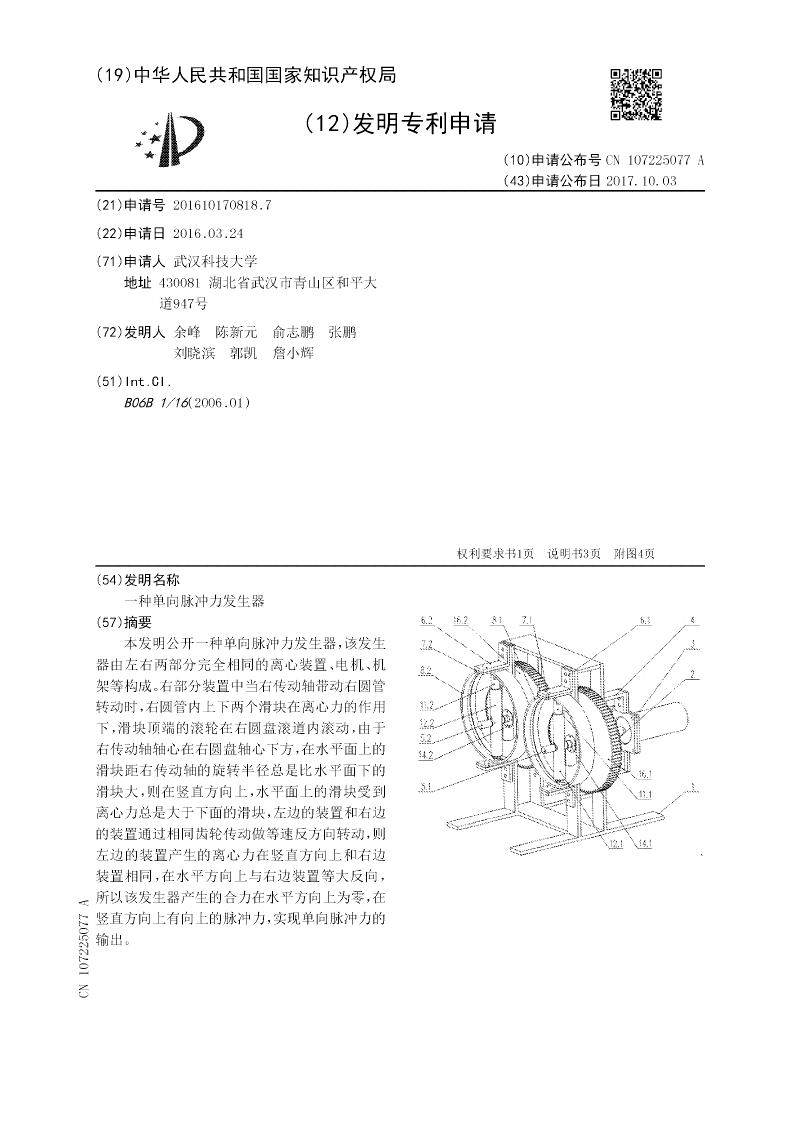 本发明公开一种单向脉冲力发生器,该发生器由左右两部分完全相同的离心装置、电机、机架等构成。右部分装置中当右传动轴带动右圆管转动时,右圆管内上下两个滑块在离心力的作用下,滑块顶端的滚轮在右圆盘滚道内滚动,由于右传动轴轴心在右圆盘轴心下方,在水平面上的滑块距右传动轴的旋转半径总是比水平面下的滑块大,则在竖直方向上,水平面上的滑块受到离心力总是大于下面的滑块,左边的装置和右边的装置通过相同齿轮传动做等速反方向转动,则左边的装置产生的离心力在竖直方向上和右边装置相同,在水平方向上与右边装置等大反向,所以该发生器产生的合力在水平方向上为零,在竖直方向上有向上的脉冲力,实现单向脉冲力的输出。