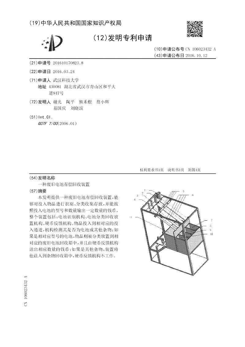 本发明提供一种废旧电池有偿回收装置,能够对投入物品进行识别、分类收集存放,并能按照投入电池的型号和数量输出一定数量的钱币。整个装置包括:电池识别机构、电池分类回收放置机构、硬币反馈机构。物品投入到相对应的投入通道,机构检测其是否为电池或其他杂物;如果是相对应型号的电池,物品则被分类放置到相对应的废旧电池回收箱中,并且由硬币反馈机构送出相应数量的钱币;如果是其他杂物,装置将他送入到杂物回收箱中,硬币反馈机构不工作。