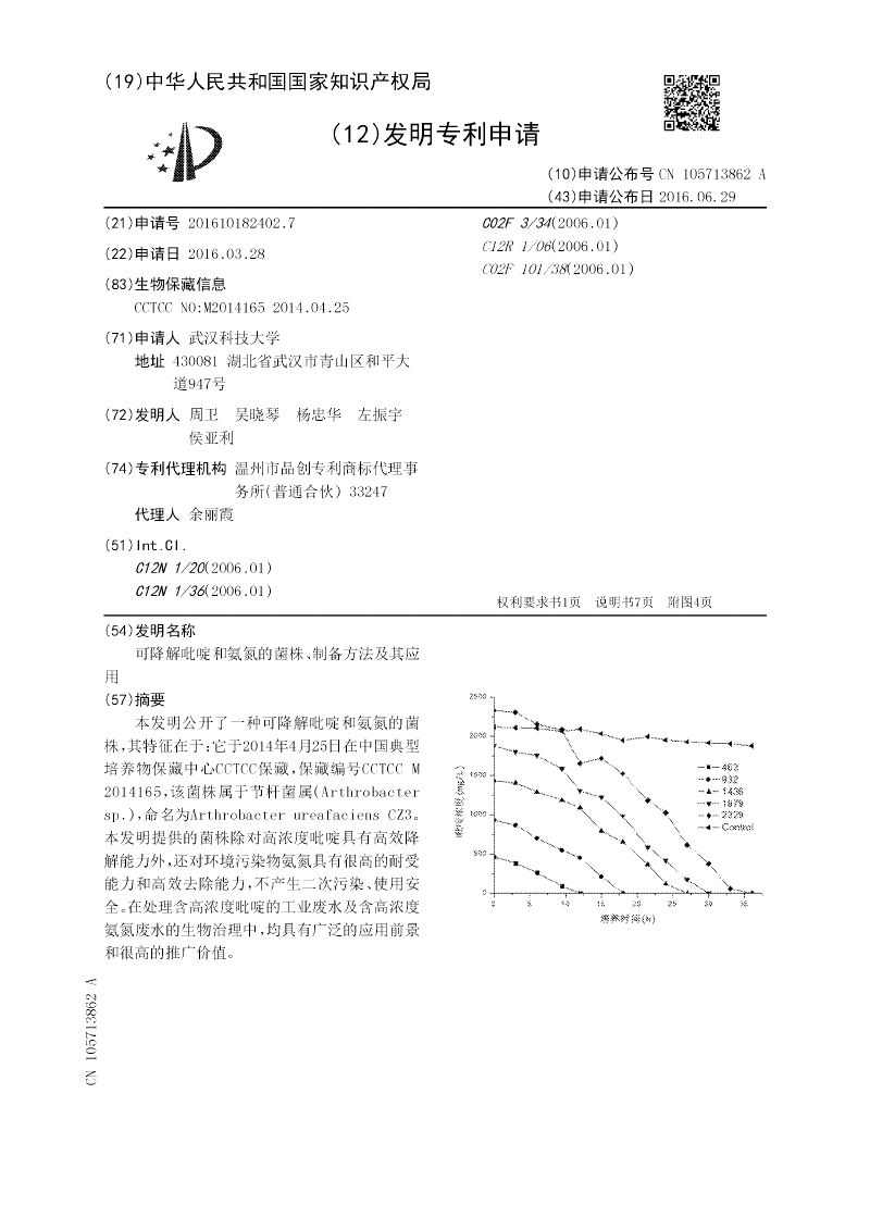 本发明公开了一种可降解吡啶和氨氮的菌株,其特征在于:它于2014年4月25日在中国典型培养物保藏中心CCTCC保藏,保藏编号CCTCC?M?2014165,该菌株属于节杆菌属(Arthrobacter?sp.),命名为Arthrobacter?ureafaciens?CZ3。本发明提供的菌株除对高浓度吡啶具有高效降解能力外,还对环境污染物氨氮具有很高的耐受能力和高效去除能力,不产生二次污染、使用安全。在处理含高浓度吡啶的工业废水及含高浓度氨氮废水的生物治理中,均具有广泛的应用前景和很高的推广价值。