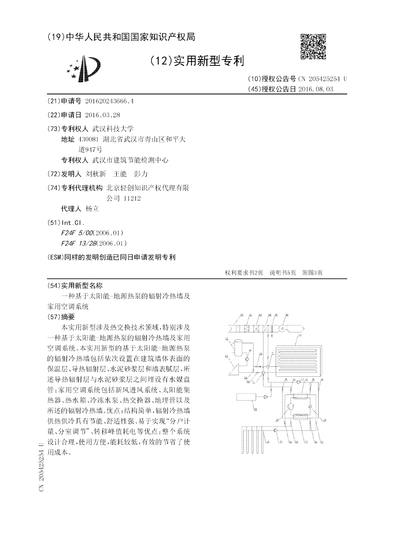 本实用新型涉及热交换技术领域,特别涉及一种基于太阳能?地源热泵的辐射冷热墙及家用空调系统。本实用新型的基于太阳能?地源热泵的辐射冷热墙包括依次设置在建筑墙体表面的保温层、导热辐射层、水泥砂浆层和墙表腻层,所述导热辐射层与水泥砂浆层之间埋设有水媒盘管;家用空调系统包括新风进风系统、太阳能集热器、热水箱、冷冻水泵、热交换器、地埋管以及所述的辐射冷热墙。优点:结构简单,辐射冷热墙供热供冷具有节能、舒适性强、易于实现“分户计量、分室调节”、转移峰值耗电等优点;整个系统设计合理,使用方便,能耗较低,有效的节省了使用成本。