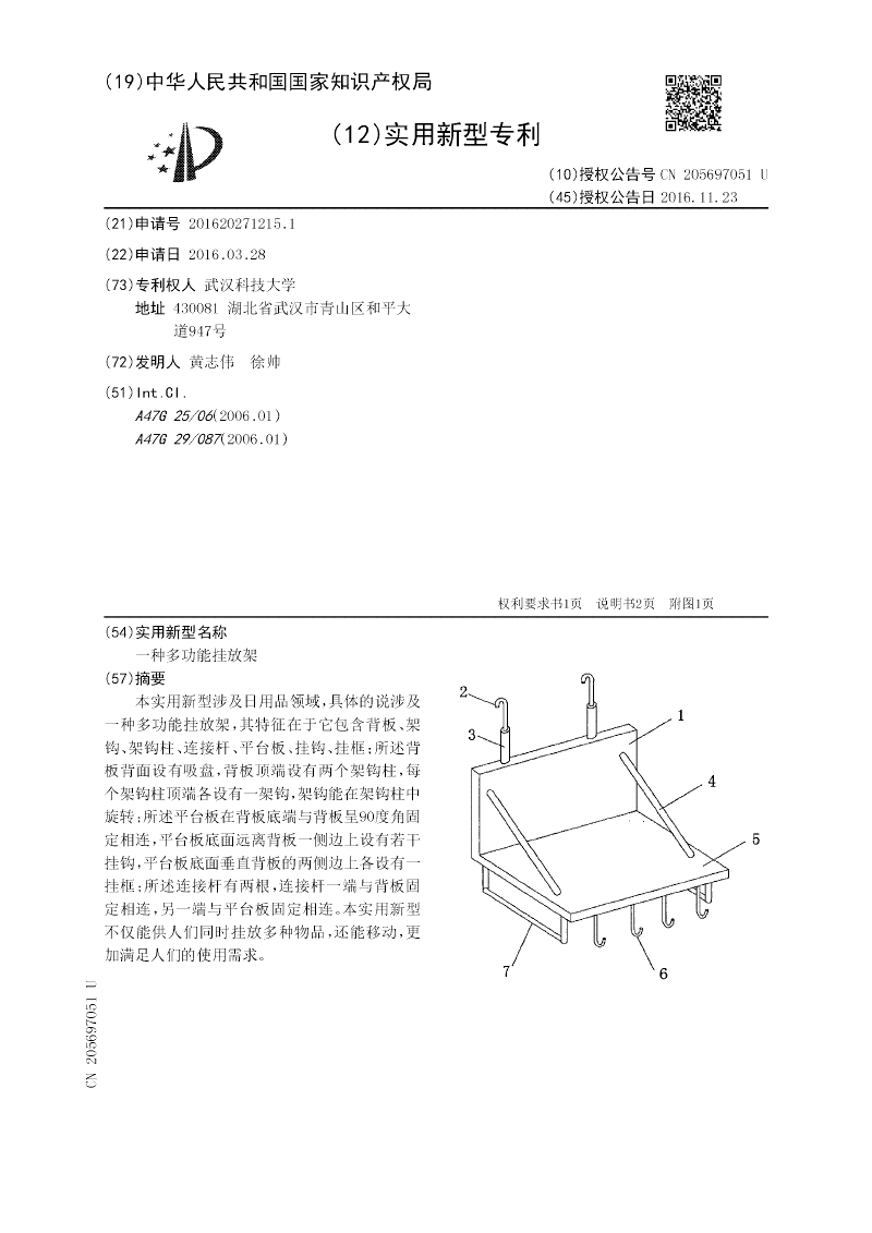 本实用新型涉及日用品领域,具体的说涉及一种多功能挂放架,其特征在于它包含背板、架钩、架钩柱、连接杆、平台板、挂钩、挂框;所述背板背面设有吸盘,背板顶端设有两个架钩柱,每个架钩柱顶端各设有一架钩,架钩能在架钩柱中旋转;所述平台板在背板底端与背板呈90度角固定相连,平台板底面远离背板一侧边上设有若干挂钩,平台板底面垂直背板的两侧边上各设有一挂框;所述连接杆有两根,连接杆一端与背板固定相连,另一端与平台板固定相连。本实用新型不仅能供人们同时挂放多种物品,还能移动,更加满足人们的使用需求。