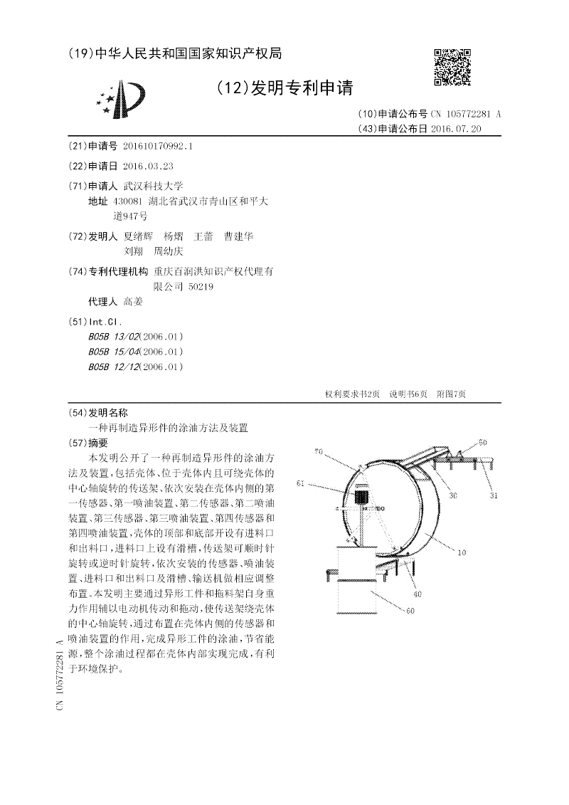 本发明涉及一种再制造异形件涂油生产线的喷油方法及装置,该再制造异形件涂油生产线的喷油方法的装置包括壳体,壳体的内部设有与壳体同轴的传送架,传送架上设有托料架,所述壳体上还设有进料口与出料口,进料口与出料口之间同侧依次在壳体内壁分别设有喷油装置一、喷油装置二、喷油装置三,出料口另一侧设有喷油装置四;所述喷油装置一上方在壳体上设有第一传感器,所述喷油装置二上方在壳体上设有第二传感器,所述喷油装置三上方在壳体上设有第三传感器,所述喷油装置四下方在壳体上设有第四传感器。本发明能在异形件的涂油过程中,涂油全面且均匀,节约喷涂用油,降低企业的生产成本。