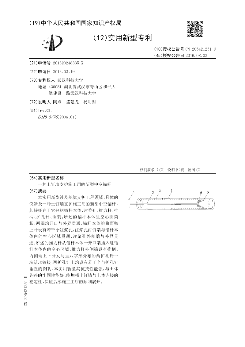 本实用新型涉及基坑支护工程领域,具体的说涉及一种土钉墙支护施工用的新型中空锚杆,其特征在于它包括锚杆本体、注浆孔、推力杆、推柄、扩孔针、倒刺;所述的锚杆本体呈空心圆筒状,两端均开口与外界贯通,锚杆本体的曲面壁上开设有若干个注浆孔,注浆孔内侧端与锚杆本体内的空心区域贯通,注浆孔外侧端与外界贯通;所述的推力杆从锚杆本体一开口端插入进锚杆本体内的空心区域,推力杆外侧端设有推柄,内侧端上下分别与呈八字形分布的两扩孔针一端活动铰接,两扩孔针上均设有若干个与扩孔针垂直的倒刺。本实用新型其抗拔性能强,与土体钩连的牢固性能好,能增强土钉墙与土体连接的稳定性,保证后续施工工序的顺利展开。