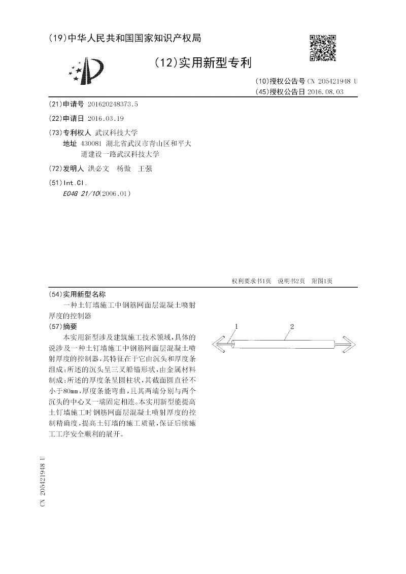 本实用新型涉及建筑施工技术领域,具体的说涉及一种土钉墙施工中钢筋网面层混凝土喷射厚度的控制器,其特征在于它由沉头和厚度条组成;所述的沉头呈三叉船锚形状,由金属材料制成;所述的厚度条呈圆柱状,其截面圆直径不小于80mm,厚度条能弯曲,且其两端分别与两个沉头的中心叉一端固定相连。本实用新型能提高土钉墙施工时钢筋网面层混凝土喷射厚度的控制精确度,提高土钉墙的施工质量,保证后续施工工序安全顺利的展开。