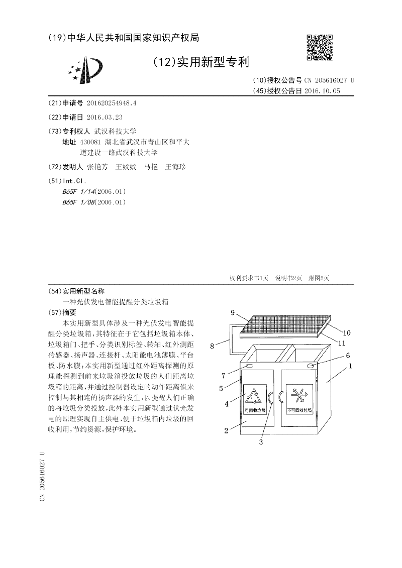 本实用新型具体涉及一种光伏发电智能提醒分类垃圾箱,其特征在于它包括垃圾箱本体、垃圾箱门、把手、分类识别标签、转轴、红外测距传感器、扬声器、连接杆、太阳能电池薄膜、平台板、防水膜;本实用新型通过红外距离探测的原理能探测到前来垃圾箱投放垃圾的人们距离垃圾箱的距离,并通过控制器设定的动作距离值来控制与其相连的扬声器的发生,以提醒人们正确的将垃圾分类投放,此外本实用新型通过伏光发电的原理实现自主供电,便于垃圾箱内垃圾的回收利用,节约资源,保护环境。
