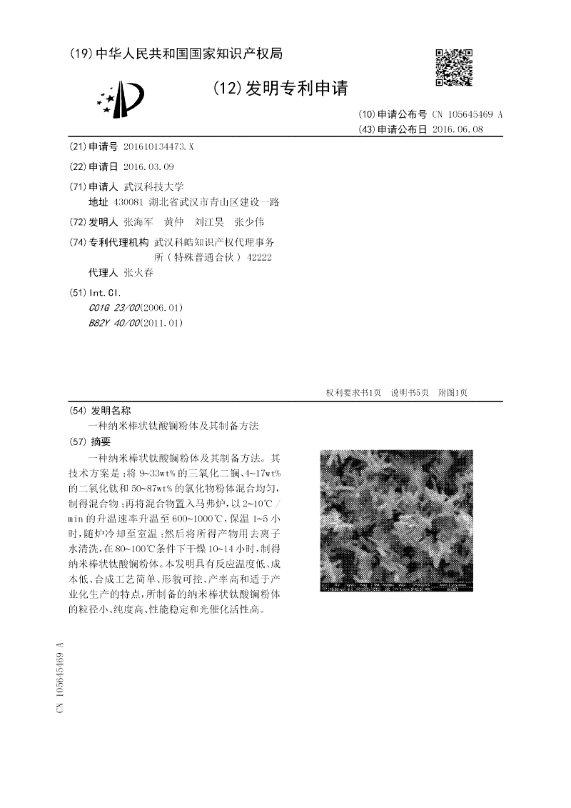 一种纳米棒状钛酸镧粉体及其制备方法。其技术方案是:将9~33wt%的三氧化二镧、4~17wt%的二氧化钛和50~87wt%的氯化物粉体混合均匀,制得混合物;再将混合物置入马弗炉,以2~10℃/min的升温速率升温至600~1000℃,保温1~5小时,随炉冷却至室温;然后将所得产物用去离子水清洗,在80~100℃条件下干燥10~14小时,制得纳米棒状钛酸镧粉体。本发明具有反应温度低、成本低、合成工艺简单、形貌可控、产率高和适于产业化生产的特点,所制备的纳米棒状钛酸镧粉体的粒径小、纯度高、性能稳定和光催化活性高。