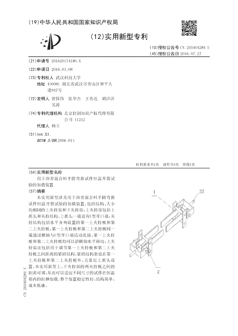 本实用新型涉及用于沥青混合料半圆弯曲试件恒温开裂试验的加载装置。包括结构、大小均相同的上夹持部和下夹持部;上夹持部包括上抓头和夹持结构,上抓头一端设有U型开口端;夹持结构包括水平并列设置的第一上夹持板和第二上夹持板,第一上夹持板和第二上夹持板同一端通过横轴与U型开口端活动连接,第一上夹持板和第二上夹持板均可以沿横轴水平移动;上夹持部还包括用于调节第一上夹持板和第二上夹持板之间距离的紧固结构,紧固结构套设在第一上夹持板和第二上夹持板外,且靠近上抓头设置。本实用新型上、下夹持部的两夹持板之间的距离可调,从而可以适应不同尺寸的试件在恒温箱内的拉伸加载,整个装置稳定性好,结构简单,成本低廉。