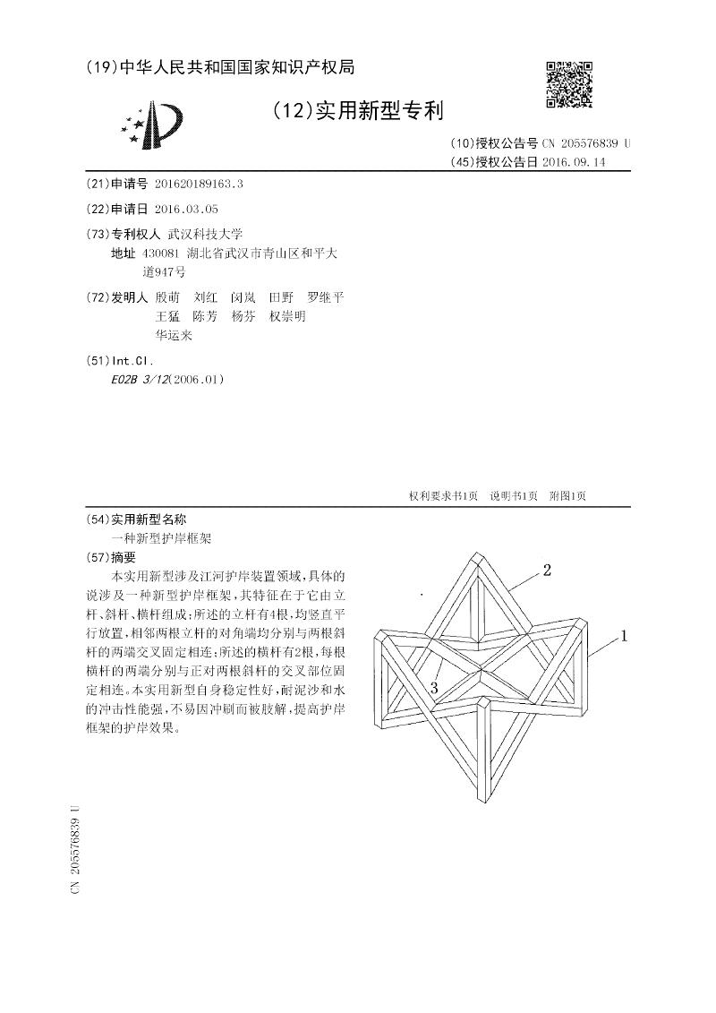 本实用新型涉及江河护岸装置领域,具体的说涉及一种新型护岸框架,其特征在于它由立杆、斜杆、横杆组成;所述的立杆有4根,均竖直平行放置,相邻两根立杆的对角端均分别与两根斜杆的两端交叉固定相连;所述的横杆有2根,每根横杆的两端分别与正对两根斜杆的交叉部位固定相连。本实用新型自身稳定性好,耐泥沙和水的冲击性能强,不易因冲刷而被肢解,提高护岸框架的护岸效果。
