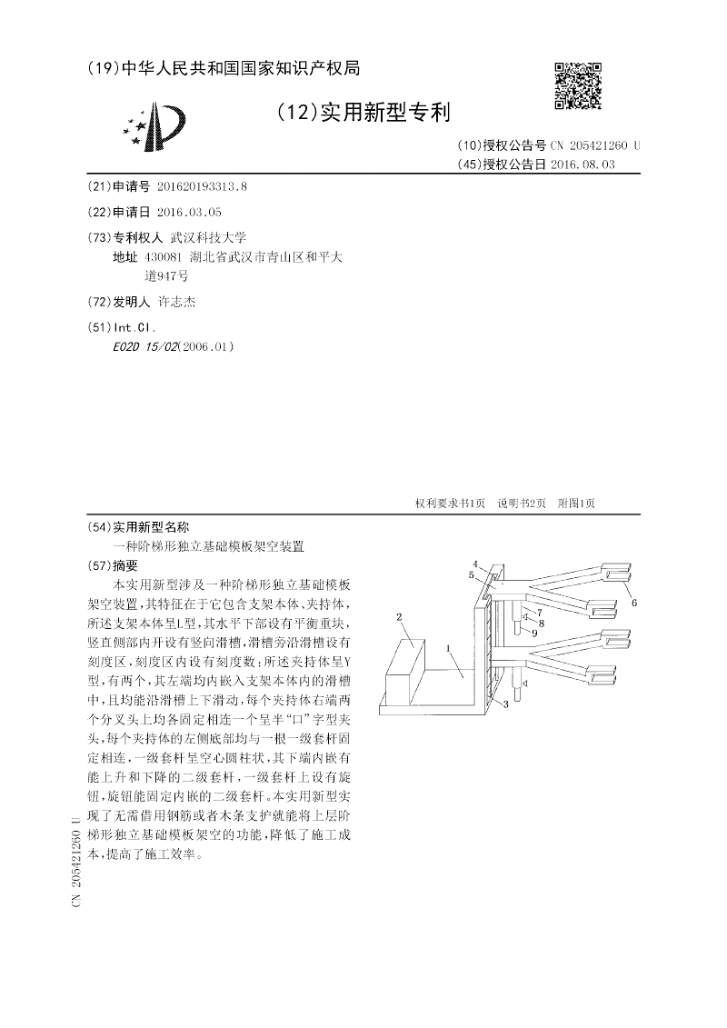 本实用新型涉及一种阶梯形独立基础模板架空装置,其特征在于它包含支架本体、夹持体,所述支架本体呈L型,其水平下部设有平衡重块,竖直侧部内开设有竖向滑槽,滑槽旁沿滑槽设有刻度区,刻度区内设有刻度数;所述夹持体呈Y型,有两个,其左端均内嵌入支架本体内的滑槽中,且均能沿滑槽上下滑动,每个夹持体右端两个分叉头上均各固定相连一个呈半“口”字型夹头,每个夹持体的左侧底部均与一根一级套杆固定相连,一级套杆呈空心圆柱状,其下端内嵌有能上升和下降的二级套杆,一级套杆上设有旋钮,旋钮能固定内嵌的二级套杆。本实用新型实现了无需借用钢筋或者木条支护就能将上层阶梯形独立基础模板架空的功能,降低了施工成本,提高了施工效率。