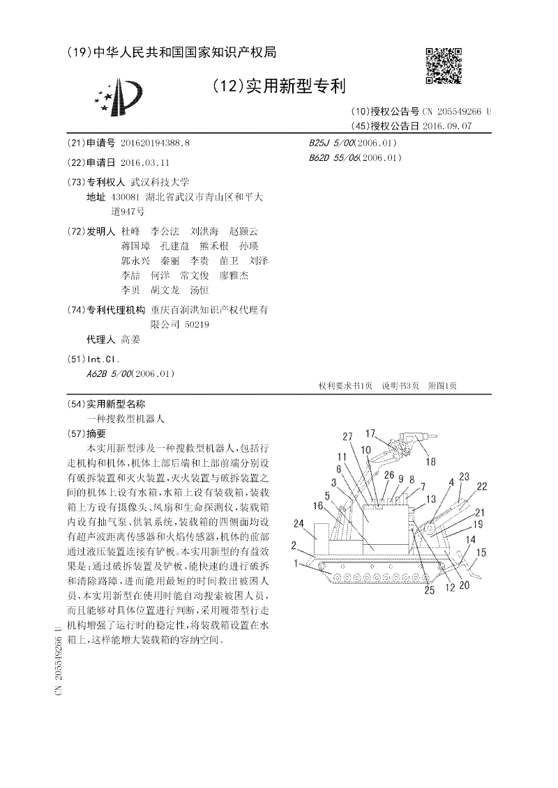 本实用新型涉及一种搜救型机器人,包括行走机构和机体,机体上部后端和上部前端分别设有破拆装置和灭火装置,灭火装置与破拆装置之间的机体上设有水箱,水箱上设有装载箱,装载箱上方设有摄像头、风扇和生命探测仪,装载箱内设有抽气泵、供氧系统,装载箱的四侧面均设有超声波距离传感器和火焰传感器,机体的前部通过液压装置连接有铲板。本实用新型的有益效果是:通过破拆装置及铲板,能快速的进行破拆和清除路障,进而能用最短的时间救出被困人员,本实用新型在使用时能自动搜索被困人员,而且能够对具体位置进行判断,采用履带型行走机构增强了运行时的稳定性,将装载箱设置在水箱上,这样能增大装载箱的容纳空间。