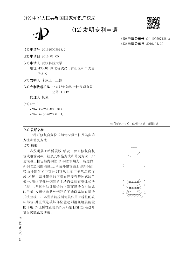本实用新型属于路桥领域,涉及一种可修复自复位式钢管混凝土柱,更具体地说是一种用于人行天桥或高架桥的桥柱,包括内钢管、外钢管和填充于所述内、外钢管之间的混凝土,所述外钢管由上部外钢管、带肋外钢管和下部外钢管从上至下依次连接而成,所述上部外钢管的下端面焊接有整体式法兰板一,所述下部外钢管的上端面焊接有整体式法兰板二,所述带肋外钢管的上端面焊接有拼接式法兰板一,所述带肋外钢管的下端面焊接有拼接式法兰板二。本实用新型能控制地震作用时桥柱的破坏部位,并且预选破坏部位能起到消耗地震能量的作用,保证桥柱在地震作用后能自复位,经过修复后仍能正常使用。