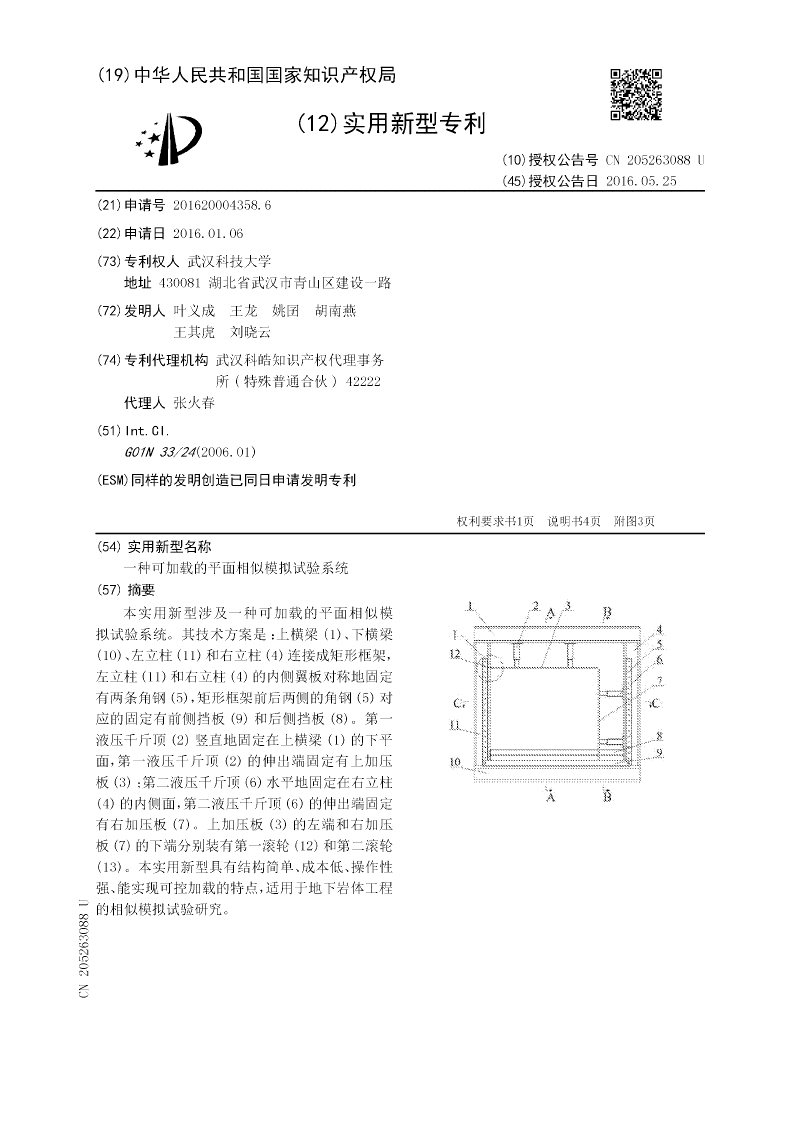 本实用新型涉及一种可加载的平面相似模拟试验系统。其技术方案是:上横梁(1)、下横梁(10)、左立柱(11)和右立柱(4)连接成矩形框架,左立柱(11)和右立柱(4)的内侧翼板对称地固定有两条角钢(5),矩形框架前后两侧的角钢(5)对应的固定有前侧挡板(9)和后侧挡板(8)。第一液压千斤顶(2)竖直地固定在上横梁(1)的下平面,第一液压千斤顶(2)的伸出端固定有上加压板(3);第二液压千斤顶(6)水平地固定在右立柱(4)的内侧面,第二液压千斤顶(6)的伸出端固定有右加压板(7)。上加压板(3)的左端和右加压板(7)的下端分别装有第一滚轮(12)和第二滚轮(13)。本实用新型具有结构简单、成本低、操作性强、能实现可控加载的特点,适用于地下岩体工程的相似模拟试验研究。