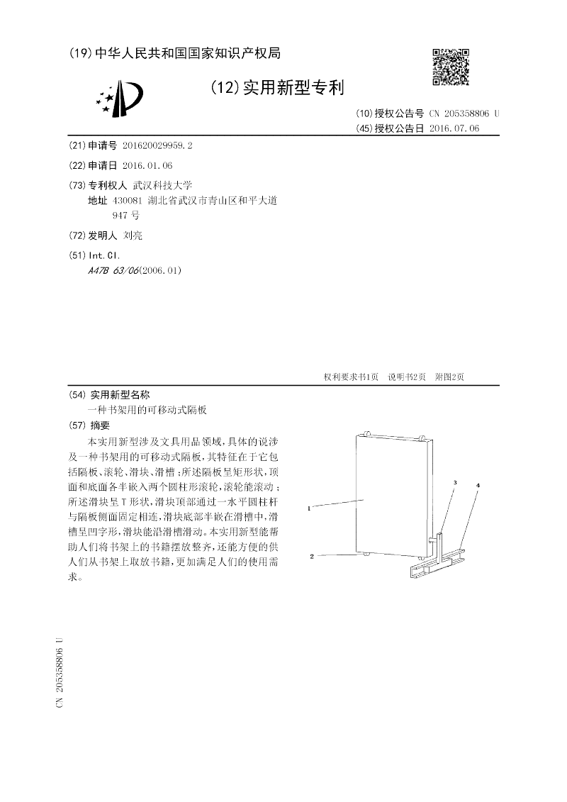 本实用新型涉及文具用品领域,具体的说涉及一种书架用的可移动式隔板,其特征在于它包括隔板、滚轮、滑块、滑槽;所述隔板呈矩形状,顶面和底面各半嵌入两个圆柱形滚轮,滚轮能滚动;所述滑块呈T形状,滑块顶部通过一水平圆柱杆与隔板侧面固定相连,滑块底部半嵌在滑槽中,滑槽呈凹字形,滑块能沿滑槽滑动。本实用新型能帮助人们将书架上的书籍摆放整齐,还能方便的供人们从书架上取放书籍,更加满足人们的使用需求。