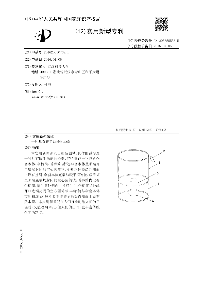 本实用新型涉及日用品领域,具体的说涉及一种具有暖手功能的伞套,其特征在于它包含伞套本体、伞柄筒、暖手筒;所述伞套本体呈顶端开口底端封闭的空心圆筒状,伞套本体顶端外侧面上设有挂绳,伞套本体底端与暖手筒连接,暖手筒呈顶端底端均封闭的空心圆筒状,暖手筒内设有伞柄筒,暖手筒外侧面上设有手孔,伞柄筒呈顶端开口底端封闭的空心圆筒状,伞柄筒与伞套本体贯通相连;所述伞套本体和伞柄筒内侧面上设有防水膜。本实用新型能在人们打伞时给人们的手保暖,又能收纳伞,方便人们的出行,也丰富传统伞套的功能。