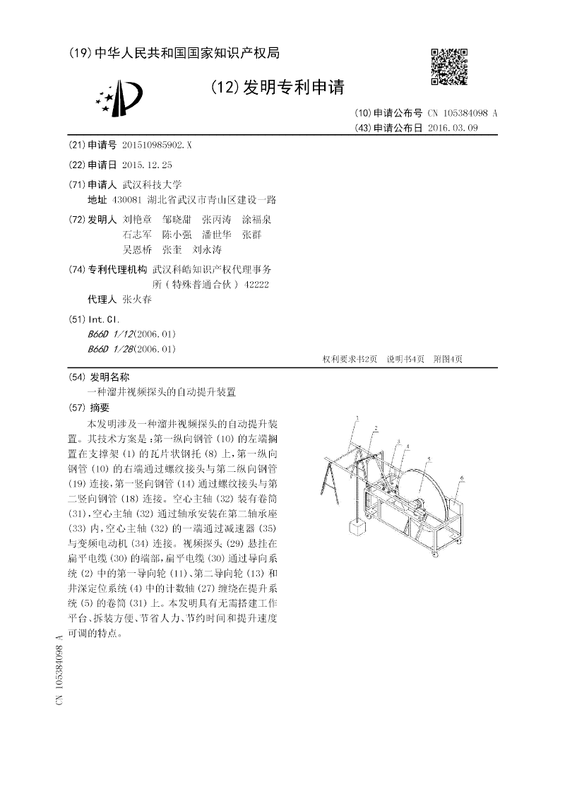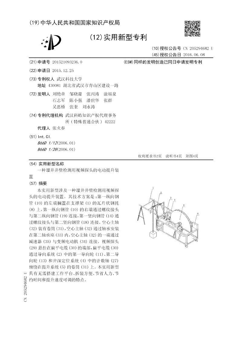 本实用新型涉及一种溜井井壁检测用视频探头的电动提升装置。其技术方案是:第一纵向钢管(10)的左端搁置在支撑架(1)的瓦片状钢托(8)上,第一纵向钢管(10)的右端通过螺纹接头与第二纵向钢管(19)连接,第一竖向钢管(14)通过螺纹接头与第二竖向钢管(18)连接。空心主轴(32)装有卷筒(31),空心主轴(32)通过轴承安装在第二轴承座(33)内,空心主轴(32)的一端通过减速器(35)与变频电动机(34)连接。视频探头(29)悬挂在扁平电缆(30)的端部,扁平电缆(30)通过导向系统(2)中的第一导向轮(11)、第二导向轮(13)和井深定位系统(4)中的计数轴(27)缠绕在提升系统(5)的卷筒(31)上。本实用新型具有无需搭建工作平台、拆装方便、节省人力、节约时间和提升速度可调的特点。