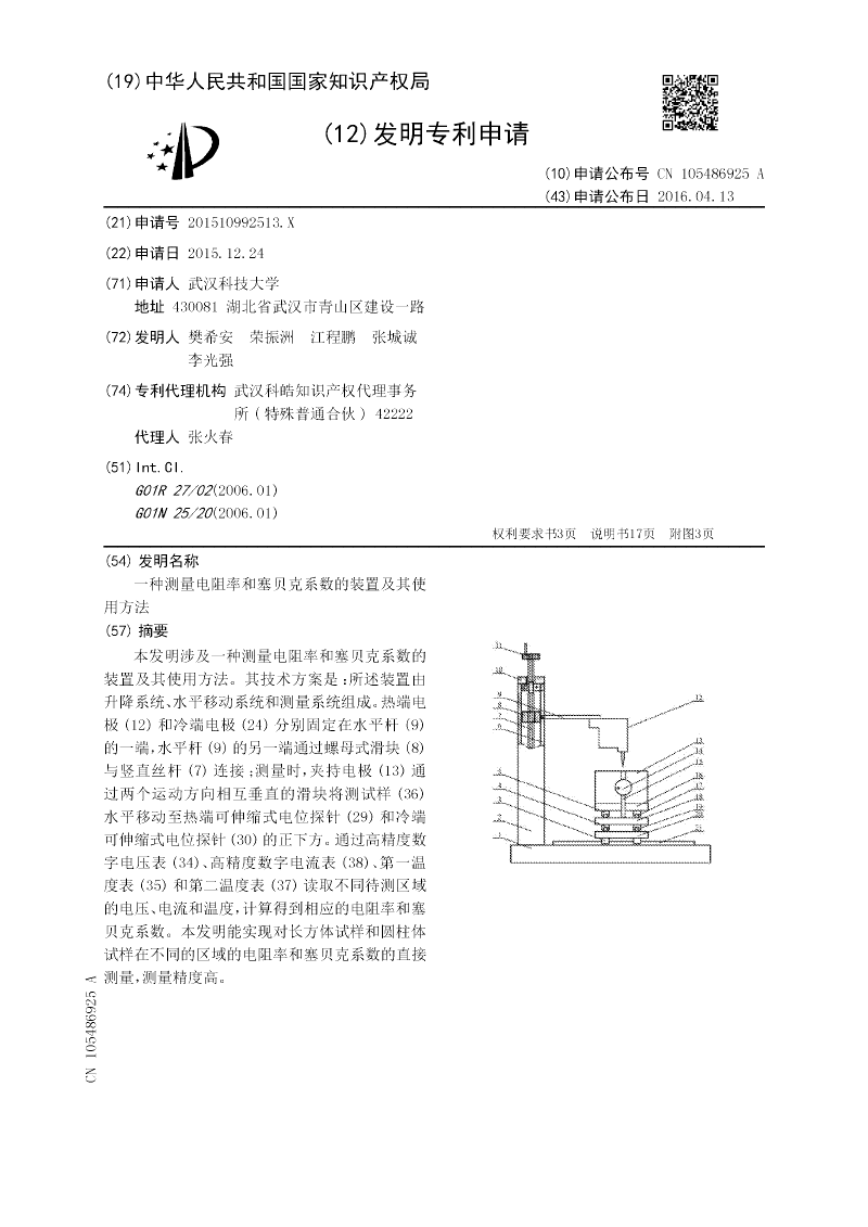 本实用新型涉及一种半导体材料电阻率和塞贝克系数的测量装置。其技术方案是:所述测量装置由升降系统、水平移动系统和测量系统组成。热端电极(12)和冷端电极(24)分别固定在水平杆(9)的一端,水平杆(9)的另一端通过螺母式滑块(8)与竖直丝杆(7)连接;夹持电极(13)通过两个运动方向相互垂直的滑块将测试样(36)水平移动至热端可伸缩式电位探针(29)和冷端可伸缩式电位探针(30)的正下方。两块夹持电极(13)与直流脉冲电源(33)的两个输出端对应连接;热端可伸缩式电位探针(29)和冷端可伸缩式电位探针(30)与高精度数字电压表(34)的正极和负极对应连接。本实用新型能实现对长方体试样和圆柱体试样在不同区域的电阻率和塞贝克系数的直接测量,测量精度高。