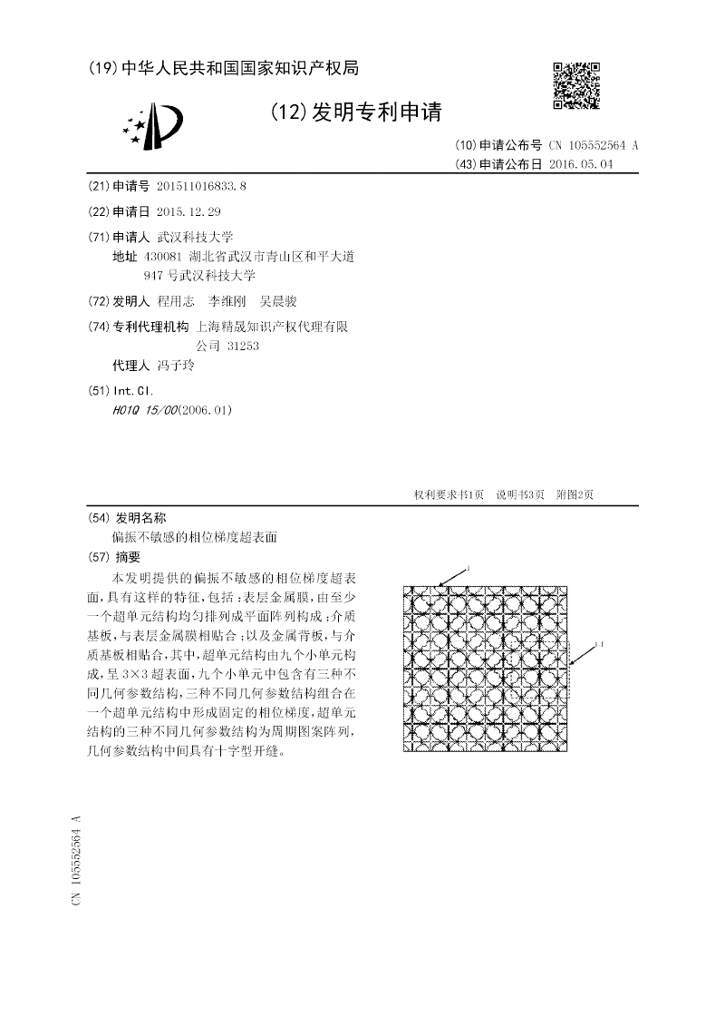 本发明提供的偏振不敏感的相位梯度超表面,具有这样的特征,包括:表层金属膜,由至少一个超单元结构均匀排列成平面阵列构成;介质基板,与表层金属膜相贴合;以及金属背板,与介质基板相贴合,其中,超单元结构由九个小单元构成,呈3×3超表面,九个小单元中包含有三种不同几何参数结构,三种不同几何参数结构组合在一个超单元结构中形成固定的相位梯度,超单元结构的三种不同几何参数结构为周期图案阵列,几何参数结构中间具有十字型开缝。