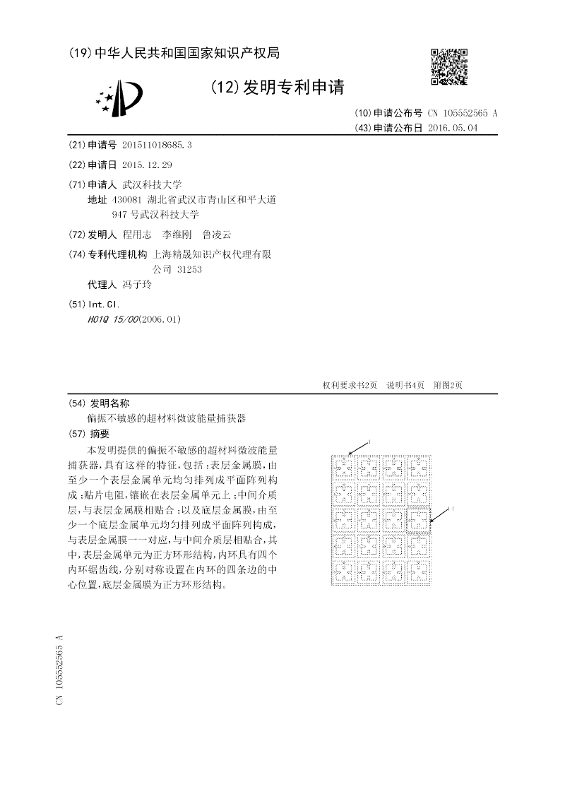 本发明提供的偏振不敏感的超材料微波能量捕获器,具有这样的特征,包括:表层金属膜,由至少一个表层金属单元均匀排列成平面阵列构成;贴片电阻,镶嵌在表层金属单元上;中间介质层,与表层金属膜相贴合;以及底层金属膜,由至少一个底层金属单元均匀排列成平面阵列构成,与表层金属膜一一对应,与中间介质层相贴合,其中,表层金属单元为正方环形结构,内环具有四个内环锯齿线,分别对称设置在内环的四条边的中心位置,底层金属膜为正方环形结构。
