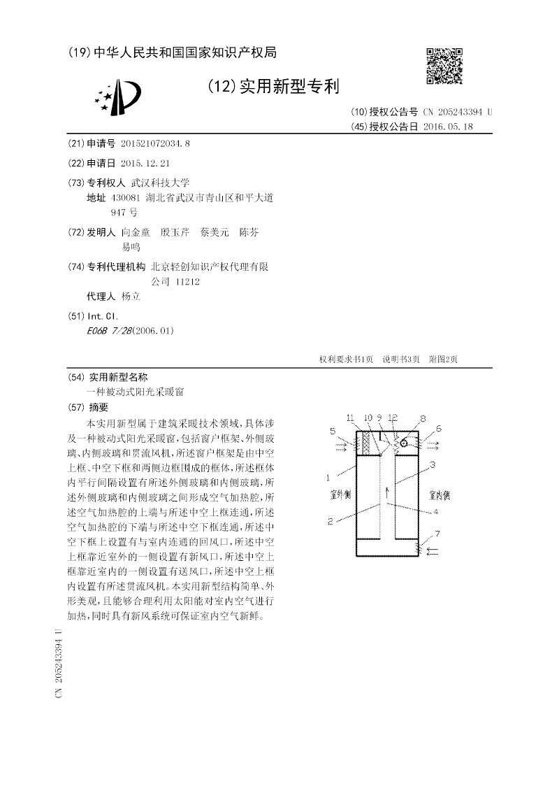本实用新型属于建筑采暖技术领域,具体涉及一种被动式阳光采暖窗,包括窗户框架、外侧玻璃、内侧玻璃和贯流风机,所述窗户框架是由中空上框、中空下框和两侧边框围成的框体,所述框体内平行间隔设置有所述外侧玻璃和内侧玻璃,所述外侧玻璃和内侧玻璃之间形成空气加热腔,所述空气加热腔的上端与所述中空上框连通,所述空气加热腔的下端与所述中空下框连通,所述中空下框上设置有与室内连通的回风口,所述中空上框靠近室外的一侧设置有新风口,所述中空上框靠近室内的一侧设置有送风口,所述中空上框内设置有所述贯流风机。本实用新型结构简单、外形美观,且能够合理利用太阳能对室内空气进行加热,同时具有新风系统可保证室内空气新鲜。