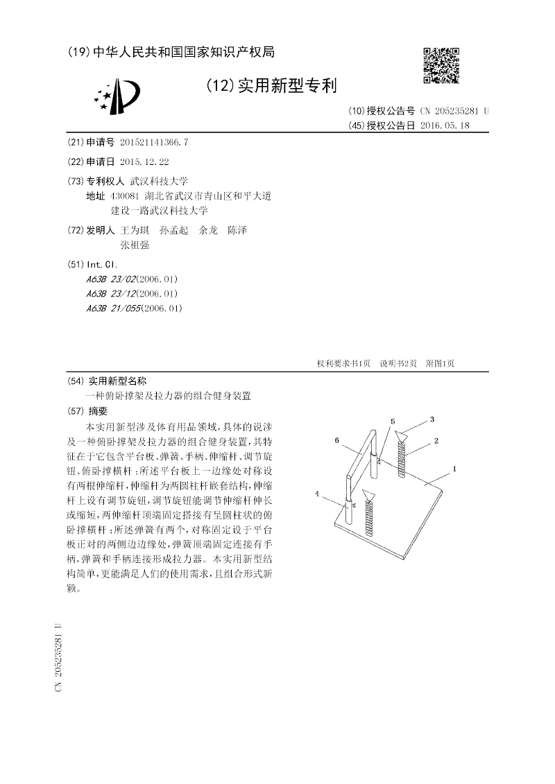 本实用新型涉及体育用品领域,具体的说涉及一种俯卧撑架及拉力器的组合健身装置,其特征在于它包含平台板、弹簧、手柄、伸缩杆、调节旋钮、俯卧撑横杆;所述平台板上一边缘处对称设有两根伸缩杆,伸缩杆为两圆柱杆嵌套结构,伸缩杆上设有调节旋钮,调节旋钮能调节伸缩杆伸长或缩短,两伸缩杆顶端固定搭接有呈圆柱状的俯卧撑横杆;所述弹簧有两个,对称固定设于平台板正对的两侧边边缘处,弹簧顶端固定连接有手柄,弹簧和手柄连接形成拉力器。本实用新型结构简单,更能满足人们的使用需求,且组合形式新颖。