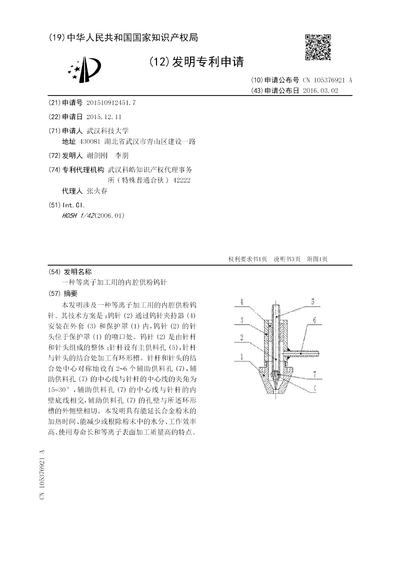 本发明涉及一种等离子加工用的内腔供粉钨针。其技术方案是:钨针(2)通过钨针夹持器(4)安装在外套(3)和保护罩(1)内,钨针(2)的针头位于保护罩(1)的喷口处。钨针(2)是由针杆和针头组成的整体;针杆设有主供料孔(5),针杆与针头的结合处加工有环形槽。针杆和针头的结合处中心对称地设有2~6个辅助供料孔(7),辅助供料孔(7)的中心线与针杆的中心线的夹角为15~30°,辅助供料孔(7)的中心线与针杆的内壁底线相交,辅助供料孔(7)的孔壁与所述环形槽的外侧壁相切。本发明具有能延长合金粉末的加热时间、能减少或根除粉末中的水分、工作效率高、使用寿命长和等离子表面加工质量高的特点。