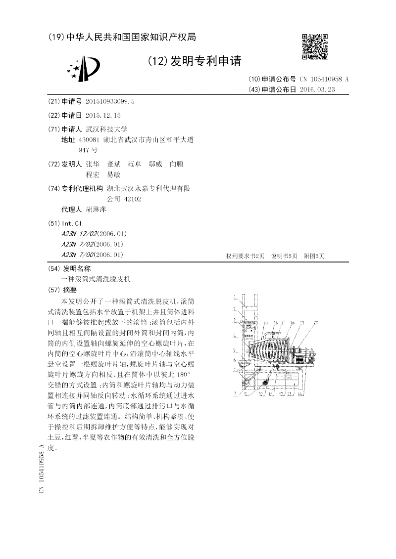 本实用新型公开了一种滚筒式清洗脱皮机,滚筒式清洗装置包括水平放置于机架上并且筒体进料口一端能够被推起或放下的滚筒;滚筒包括内外同轴且相互间隔设置的封闭外筒和封闭内筒,内筒的内侧设置轴向螺旋延伸的空心螺旋叶片,在内筒的空心螺旋叶片中心,沿滚筒中心轴线水平悬空设置一根螺旋叶片轴,螺旋叶片轴与空心螺旋叶片螺旋方向相反、且在筒体中以彼此180°交错的方式设置;内筒和螺旋叶片轴均与动力装置相连接并同轴反向转动;水循环系统通过进水管与内筒内部连通,内筒底部通过排污口与水循环系统的过滤装置连通。结构简单、机构紧凑、便于操控和后期拆卸维护方便等特点,能够实现对土豆,红薯,半夏等农作物的有效清洗和全方位脱皮。