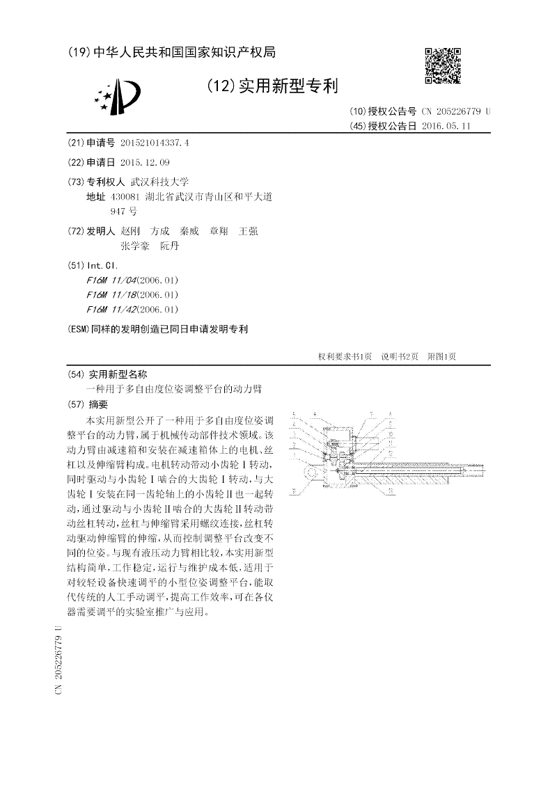 本实用新型公开了一种用于多自由度位姿调整平台的动力臂,属于机械传动部件技术领域。该动力臂由减速箱和安装在减速箱体上的电机、丝杠以及伸缩臂构成。电机转动带动小齿轮Ⅰ转动,同时驱动与小齿轮Ⅰ啮合的大齿轮Ⅰ转动,与大齿轮Ⅰ安装在同一齿轮轴上的小齿轮Ⅱ也一起转动,通过驱动与小齿轮Ⅱ啮合的大齿轮Ⅱ转动带动丝杠转动,丝杠与伸缩臂采用螺纹连接,丝杠转动驱动伸缩臂的伸缩,从而控制调整平台改变不同的位姿。与现有液压动力臂相比较,本实用新型结构简单,工作稳定,运行与维护成本低,适用于对较轻设备快速调平的小型位姿调整平台,能取代传统的人工手动调平,提高工作效率,可在各仪器需要调平的实验室推广与应用。