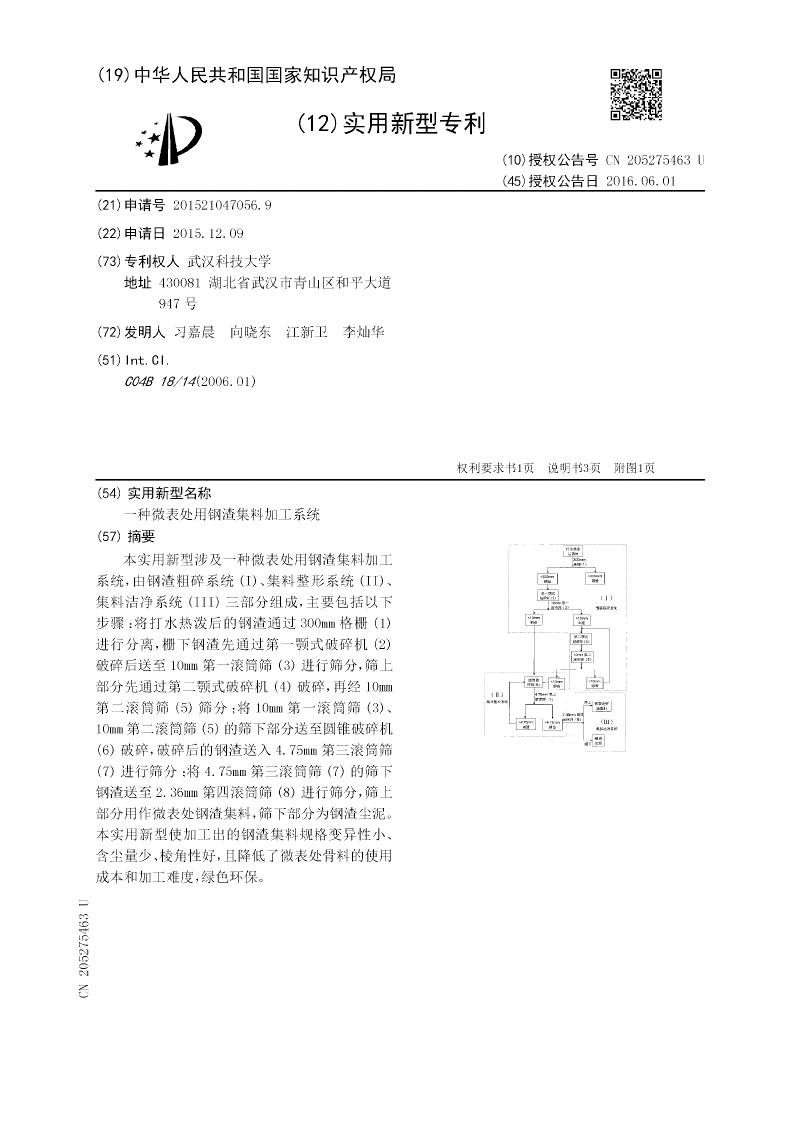 本实用新型涉及一种微表处用钢渣集料加工系统,由钢渣粗碎系统(I)、集料整形系统(II)、集料洁净系统(III)三部分组成,主要包括以下步骤:将打水热泼后的钢渣通过300mm格栅(1)进行分离,栅下钢渣先通过第一颚式破碎机(2)破碎后送至10mm第一滚筒筛(3)进行筛分,筛上部分先通过第二颚式破碎机(4)破碎,再经10mm第二滚筒筛(5)筛分;将10mm第一滚筒筛(3)、10mm第二滚筒筛(5)的筛下部分送至圆锥破碎机(6)破碎,破碎后的钢渣送入4.75mm第三滚筒筛(7)进行筛分;将4.75mm第三滚筒筛(7)的筛下钢渣送至2.36mm第四滚筒筛(8)进行筛分,筛上部分用作微表处钢渣集料,筛下部分为钢渣尘泥。本实用新型使加工出的钢渣集料规格变异性小、含尘量少、棱角性好,且降低了微表处骨料的使用成本和加工难度,绿色环保。