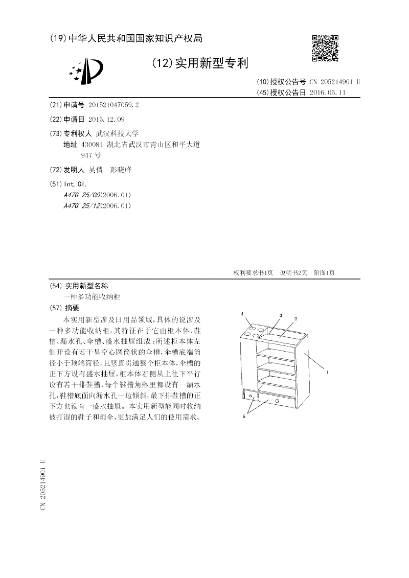 本实用新型涉及日用品领域,具体的说涉及一种多功能收纳柜,其特征在于它由柜本体、鞋槽、漏水孔、伞槽、盛水抽屉组成;所述柜本体左侧开设有若干呈空心圆筒状的伞槽,伞槽底端筒径小于顶端筒径,且竖直贯通整个柜本体,伞槽的正下方设有盛水抽屉,柜本体右侧从上往下平行设有若干排鞋槽,每个鞋槽角落里都设有一漏水孔,鞋槽底面向漏水孔一边倾斜,最下排鞋槽的正下方也设有一盛水抽屉。本实用新型能同时收纳被打湿的鞋子和雨伞,更加满足人们的使用需求。